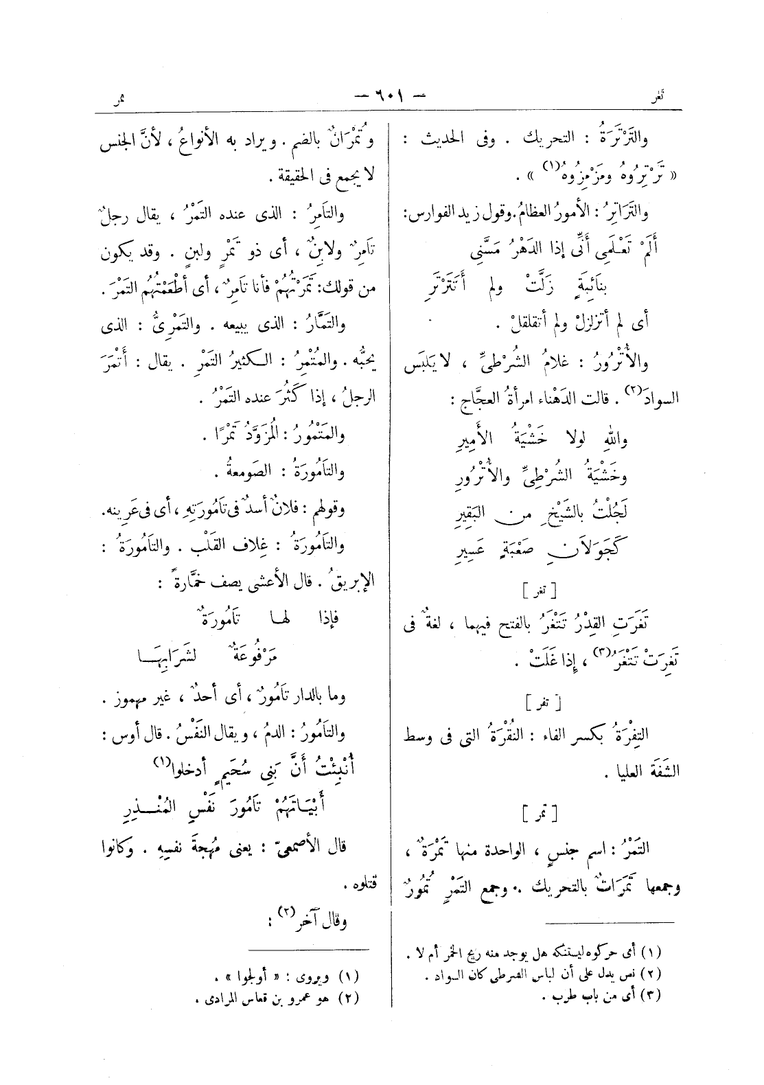 وتمران بالضم. ويراد به الأنواعُ، لأنَّ الجنس لا يجمع في الحقيقة. والتامِرٌ: الذي عنده التَمْرُ، يقال رجلٌ تامِرٌ ولابِنٌ، أي ذو تَمْرٍ ولبنٍ. وقد يكون من قولك، تَمَرْتُهُمْ فأنا تامِرٌ، أي أطْعَمْتُهُمْ التَمْرَ. والتَمَّارُ: الذي يبيعه. والتَمْريُّ: الذي يحبُّه. والمُتْمِرُ: الكثيرُ التَمْرِ. يقال: أَتْمَرَ الرجلُ، إذا كَثُرَ عنده التَمْرُ. والمَتْمورُ: المُزَوَّدُ تَمْراً. والتامورَةُ: الصَومَعَةُ. وقولهم فلانٌ أسدٌ في تامورَتِهِ: أي في عَرينه. والتامورَةُ: غِلاف القَلْب. والتامورَةُ: الإبريقُ. قال الأعشى يصف خمَّارةً: فإذا لها تامورَةٌ * مَرفوعَةٌ لشَرابِها - وما بالدار تامورٌ، أي أحدٌ، غير مهموز. والتامورُ: الدمُ، ويقال النَفْسُ. قال أوس: أُنْبِئْتُ أَنَّ بَني سحيم أدخلو (¬1) * أبياتهم تامور نفس المُنْذِرِ - قال الأصمعيّ: يعني مُهجَةَ نفسه. وكانوا قتلوه. وقال آخر (¬2) :