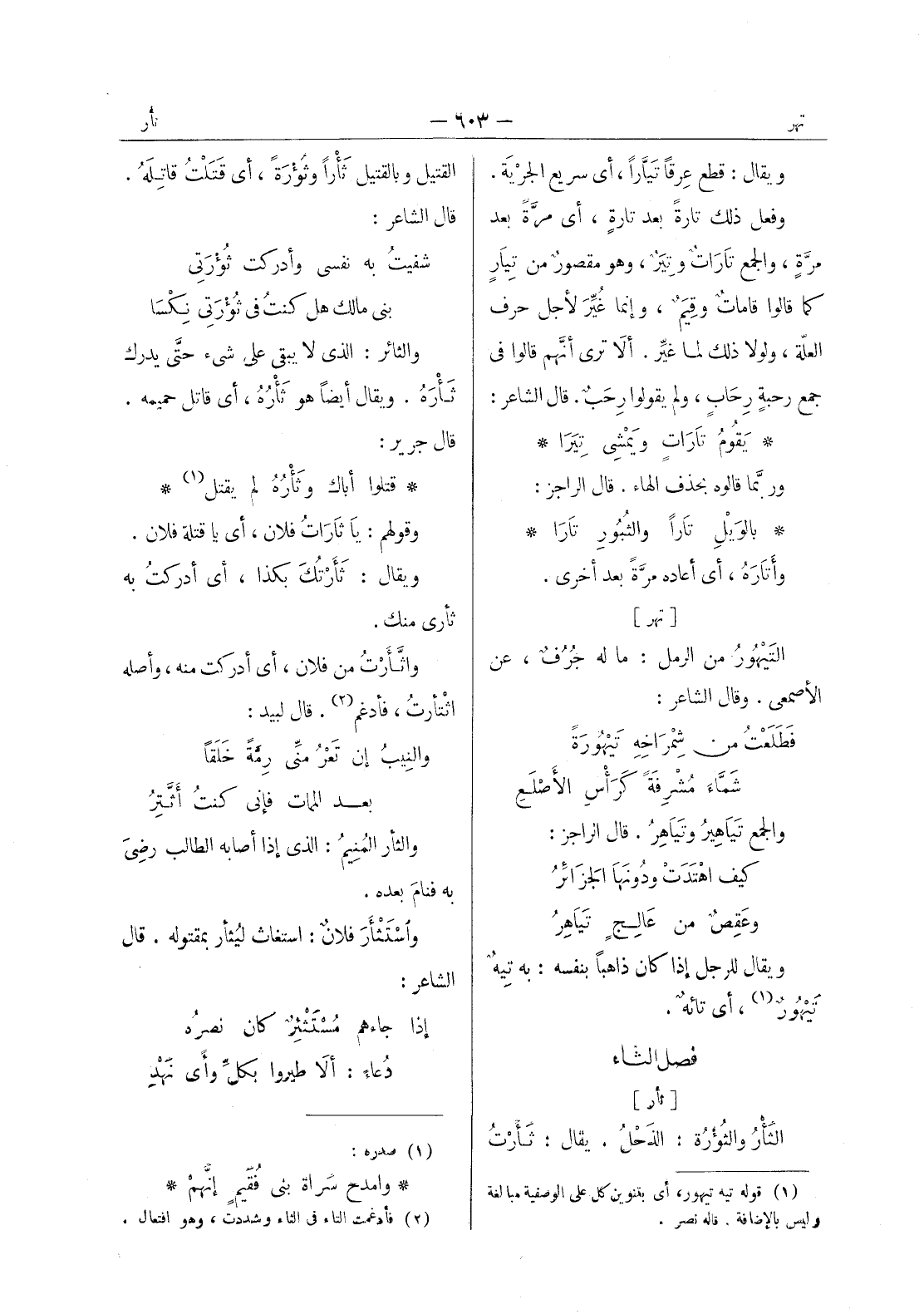 قتلوا أباك وثَأرُهُ لم يقتل (¬1) * وقولهم: يا ثاراتُ فلان، أي ياقتلة فلان. ويقال: ثأرتك بكذا، أي أدركتُ به ثأري منك. واثأرت من فلان، أي أدركت منه، وأصله اثتأرت، فأدغم (¬2) . قال لبيد: والنيب إن تعرمنى رمة خلقا * بعد الممات فإنى كنت أثتر - والثأر المنيم: الذى إذا أصابه الطالب رضيَ به فنامَ بعده. واسْتَثْأَرَ فلانٌ: استغاث ليُثأر بمقتوله. قال الشاعر: إذا جاء مستثئر كان نصره * دعاء: أَلا طيروا بكلِّ وأي نَهْدِ -