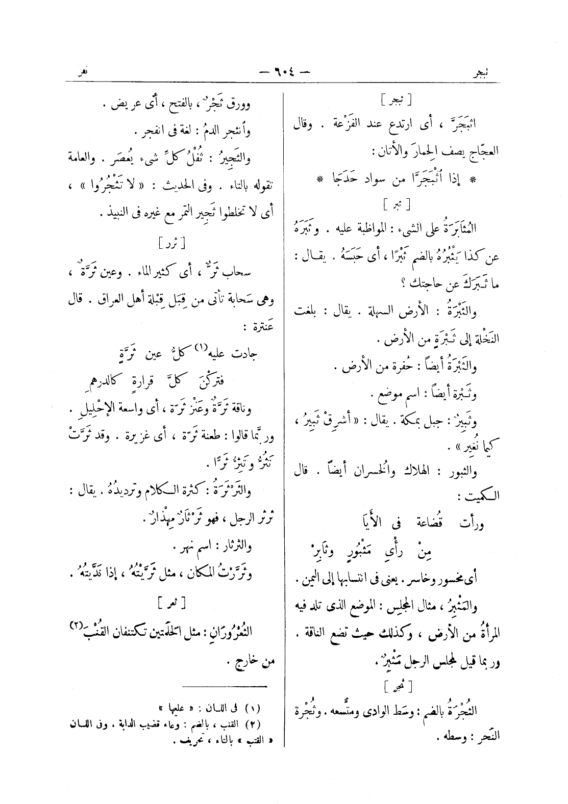 وورق ثَجْرٌ، بالفتح، أي عريض. وانثجر الدمُ: لغة في انفجر. والثَجيرُ: ثفل كل شئ يعصر. والعامة تقوله بالتاء. وفى الحديث: " لا تثجروا "، أي لا تخلطوا ثجير التمر مع غيره في النبيذ.