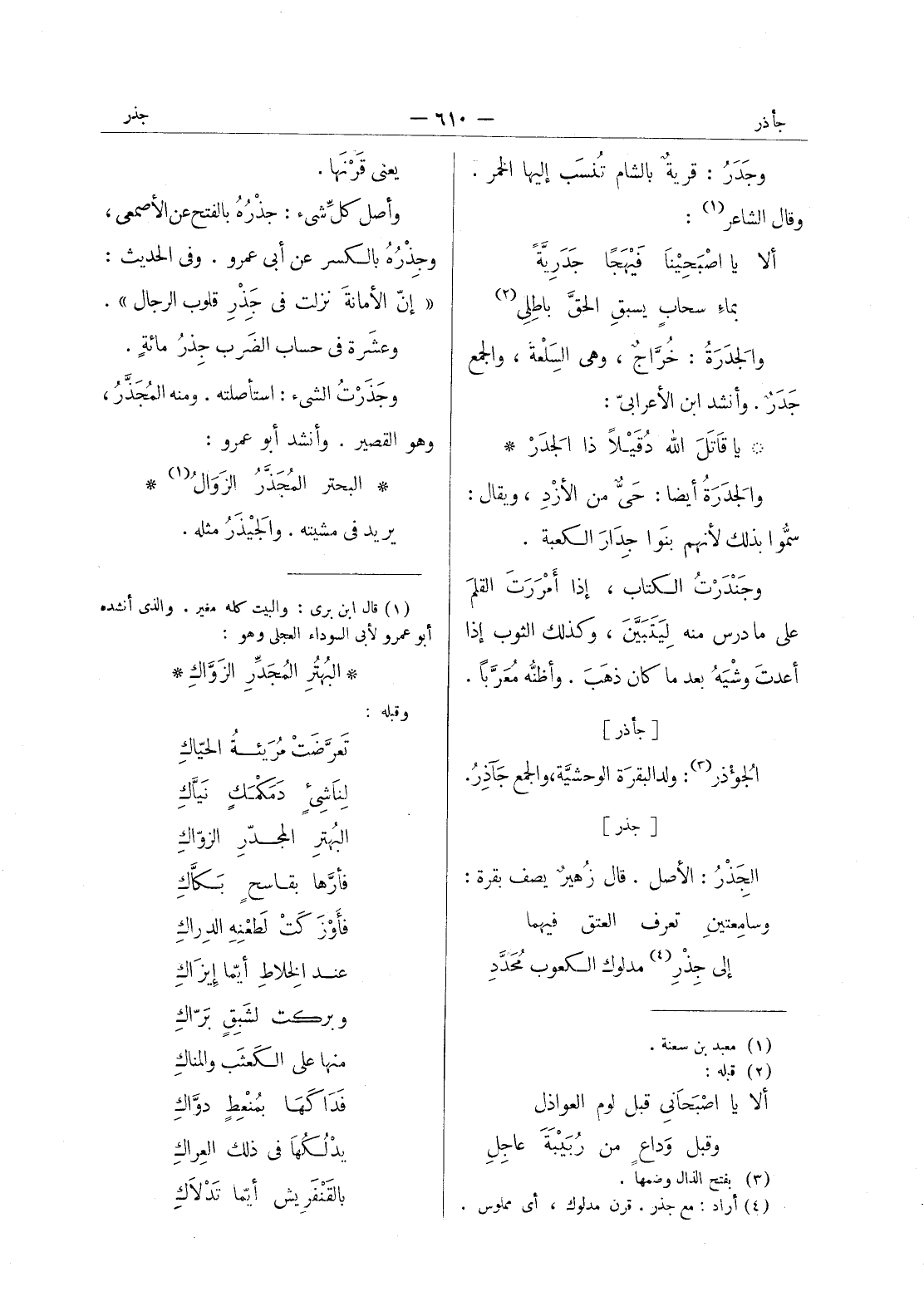 [جذر] الجذر: الاصل. قال زهير يصف بقرة: وسامعتين تعرف العتق فيهما * إلى جذر (¬4) مدلوك الكعوب محدد -