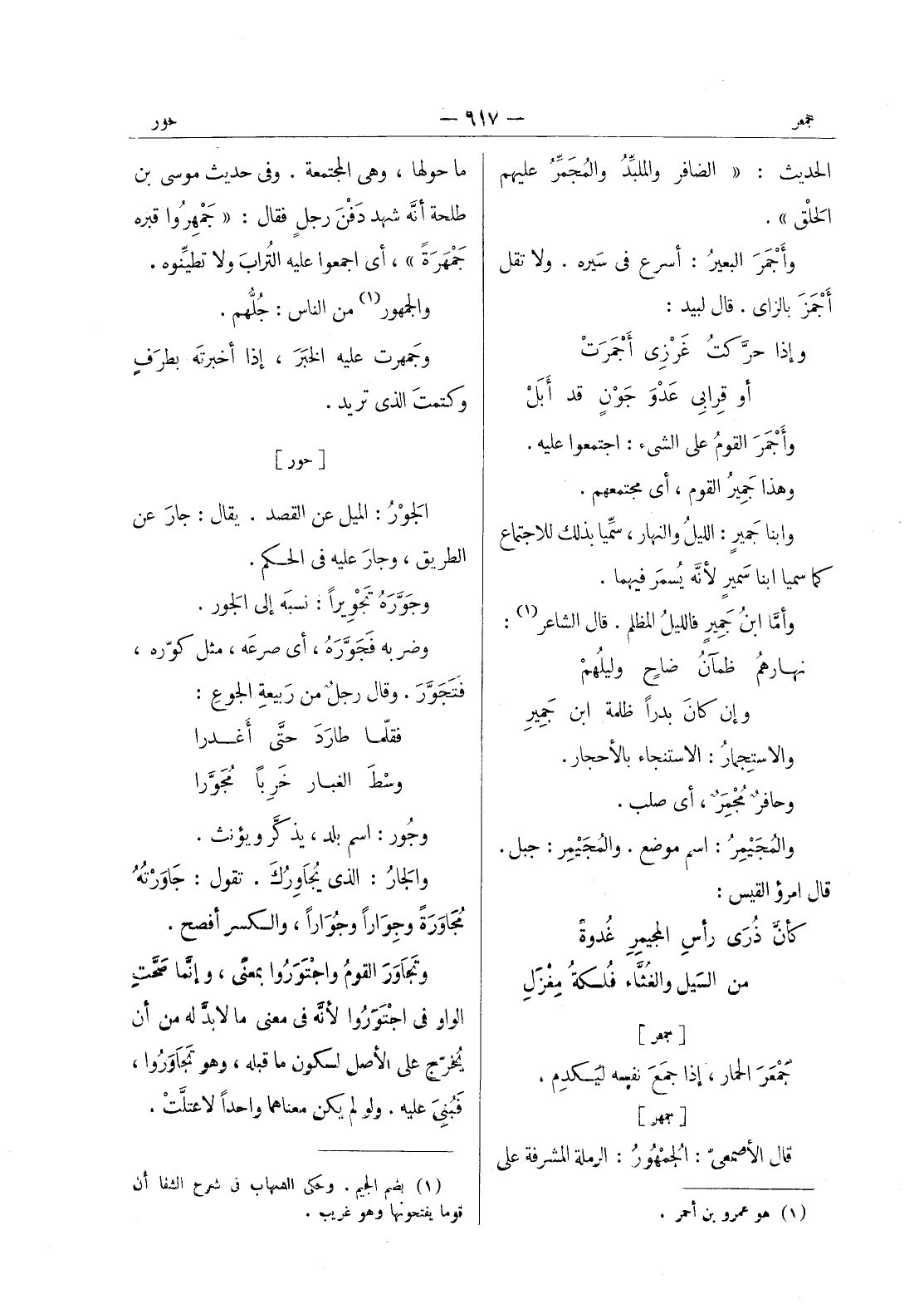 الحديث: " الضافر واللمبد والمجمر عليهم الحلق ". وأجمر البعير: أسرع في سيره. ولا تقل أجمز بالزاى. قال لبيد: وإذا حركت غرزى أجمرت * أو قرابى عدو جون قد أبل - وأجمر القوم على الشئ: اجتمعوا عليه. وهذا جَميرُ القوم، أي مجتمعهم. وابنا جَميرٍ: الليلُ والنهار، سمِّيا بذلك للاجتماع كما سميا ابنا سَميرٍ لأنَّه يُسمَر فيهما. وأمَّا ابنُ جَميرٍ فالليلُ المظلم. قال الشاعر (¬1) : نهارهُم ظمآنُ ضاحٍ وليلُهمْ * وإن كانَ بدراً ظلمة ابن جَميرِ - والاستِجمارُ: الاستنجاء بالأحجار. وحافرٌ مِجْمَرٌ، أي صلب. والمجيمر: اسم موضع والمجيمر: جبل. قال امرؤ القيس: كأن ذرى رأس المجيمر غدوة * من السيل والغثاء فلكة مغزل -