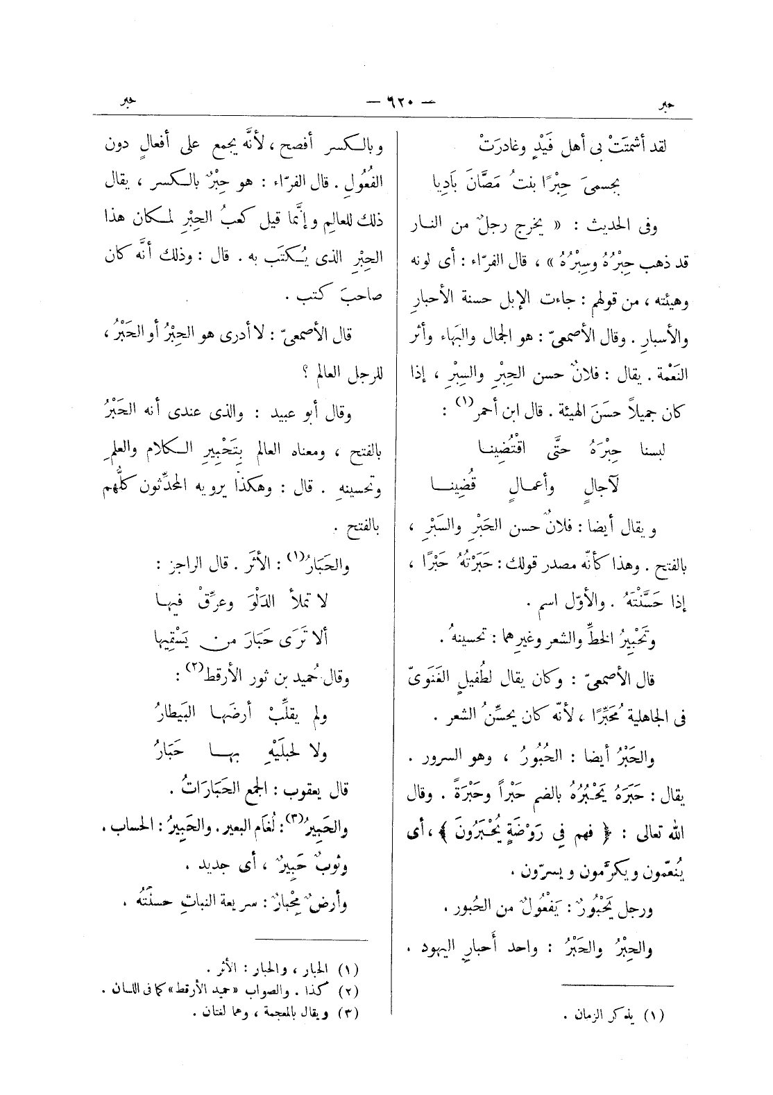 وبالسكر أفصح، لانه يجمع على أفعال دون الفعول. قال الفراء: هو حبر بالكسر، يقال ذلك للعالم وإنما قيل كعب الحبر لمكان هذا الحبر الذى يكتب به. قال: وذلك أنه كان صاحب كتب. قال الاصمعي: لا أدرى هو الحبر أو الحبر، للرجل العالم؟ وقال أبو عبيد: والذي عندي أنه الحَبْرُ بالفتح، ومعناه العالم بِتَحْبيرِ الكلام والعلم وتحسينه. قال: وهكذا يرويه المحدثون كلهم بالفتح. والحبار (¬1) : الاثر. قال الراجز: لا تملأ الدَلْوَ وعَرِّقْ فيها * ألا ترى حبار من يسقيها - وقال حميد بن ثور الارقط (¬2) : ولم يقلب أرضها البيطار * ولا لحبلية بها حبار - قال يعقوب: الجمع الحَباراتُ. والحَبيرُ (¬3) : لُغام البيعر. والحبير: الحساب. وثوب حبير، أي جديد. وأرضٌ مِحْبارٌ: سريعة النبات حسنته.