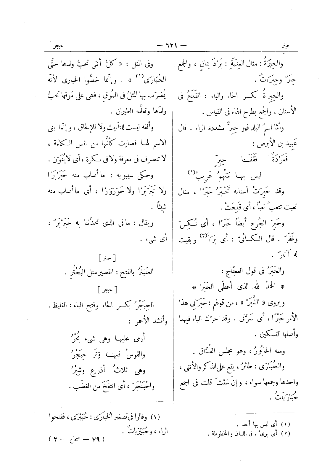 والحبرة: مثال العنبة: برد يمان، والجمع حِبَرٌ وحِبَراتٌ. والحِبِرَةُ بكسر الحاء والباء: القَلَحُ في الأٍسنان، والجمع بطرح الهاء في القياس. وأما اسم البلد فهو حبر مشددة الراء. قال عبيد بن الابرص: فعردة فقفا حبر * ليس بها منهم عريب (¬1) - وقد حَبِرَتْ أسنانه تَحْبَرُ حَبَراً، مثال تعبت تتعب تعبا، أي قَلِحَتْ. وحَبِرَ الجُرح أيضاً حَبَراً، أي نُكِسَ وغَفَرَ. قال الكسائيّ: أي بَرأَ (¬2) وبقيت له آثارٌ. والحَبَرُ في قول العجّاج:
