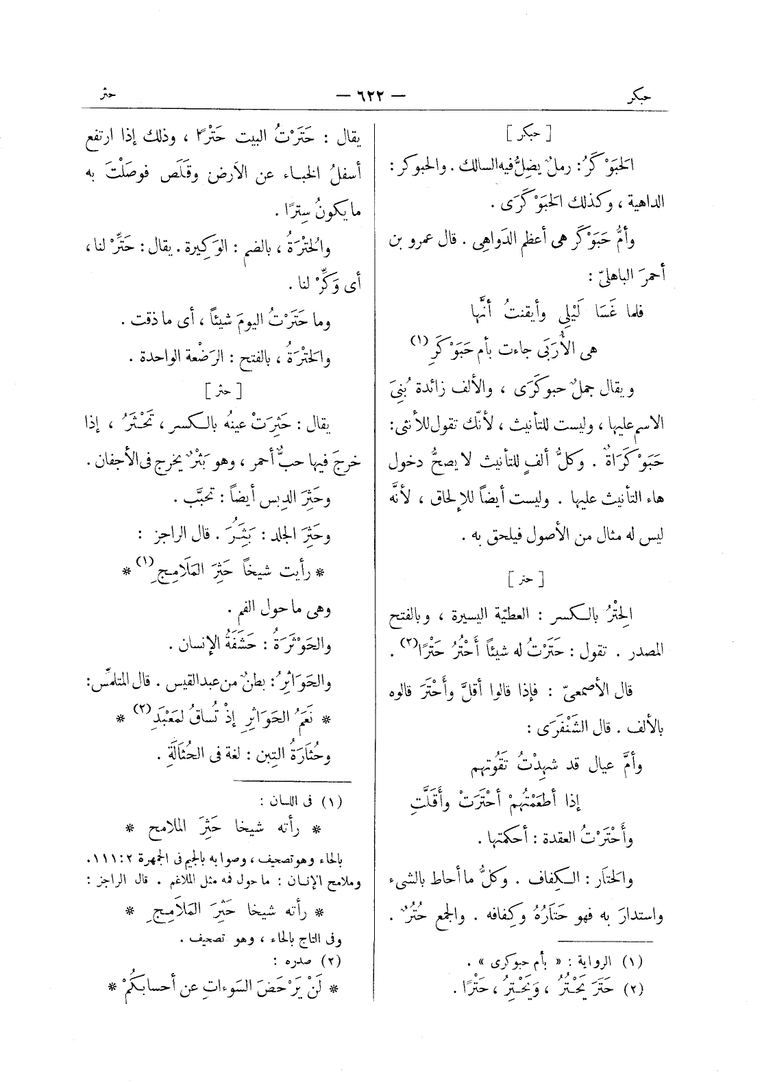 [حبكر] الحَبوكَرُ: رملٌ يضِلُّ فيه السالك. والحبوكر: الداهية، وكذلك الحَبَوْكَرى. وأمُ حَبَوْكَر هي أعظم الدَواهي. قال عمرو بن أحمر الباهلى: فلما غسا ليلى وأيقنت أنها * هي الاربى جاءت بأم حبوكر (¬1) - ويقال جمل حبوكرى، والالف زائدة بنى الاسم عليها، وليست للتأنيث، لانك تقول للانثى: حبوكراة. وكل ألف للتأنيث لا يصح دخول هاء التأنيث عليها. وليست أيضا للالحاق، لانه ليس له من الاصول فيلحق به.