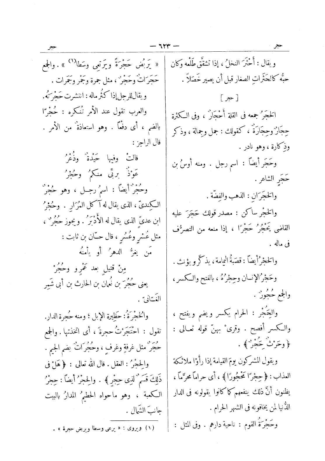 " يربض حجرة ويرتعى وسطا (¬1) ". والجمع حجرات وحجر، مثل جمرة وجمر وجمرات. ويقال للرجل إذا كثُر ماله: انتشرت حَجْرَتُه. والعرب تقول عند الأمر تُنكره: حُجْراً بالضم، أي دفْعاً. وهو استعاذة من الامر. قال الراجز: قالتْ وفيها حَيْدَةٌ وذُعْرُ * عَوْذٌ بربي منكم وحجر - وحجر أيضا: اسم رجل، وهو حجر الكندى، الذى يقال له آكل المرار. وحجر ابن عدى الذى يقال له الادبر. ويجوز حجر، مثل عسر وعسر، قال حسان بن ثابت: من يغر الدهر أو يأمنه * من قتيل بعد عمرو وحجر - يعنى حجر بن نعمان بن الحارث بن أبى شمر الغساني. والحجرة: حظيرة الإبل، ومنه حُجرة الدار. تقول: احْتَجَرْتُ حجرةً، أي اتخذتها. والجمع حجر مثل غرفة وغرف، وحجرات بضم الجيم. والحجر: العقل. قال الله تعالى: