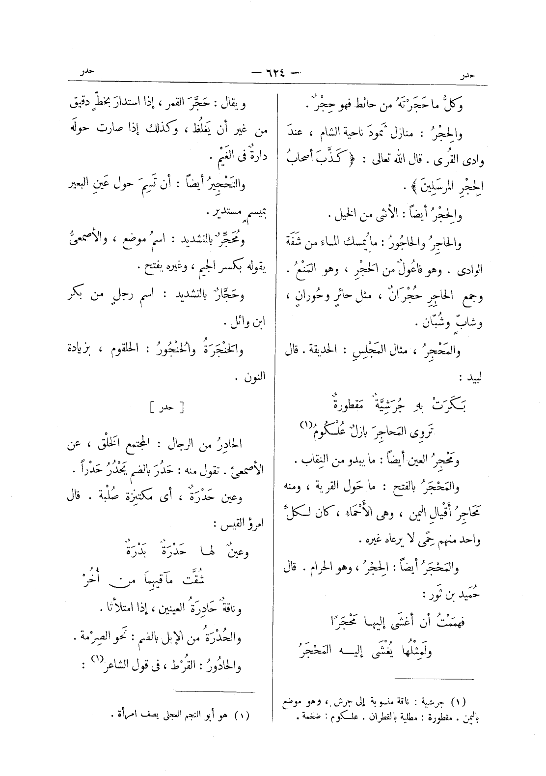 (كذب أصحاب الحجر المرسلين) *. والحجر أيضا: الانثى من الخيل. والحاجِرُ والحاجورُ: ما يُمسك الماء من شَفَة الوادي. وهو فاعولٌ من الحَجْرِ، وهو المنع. وجمع الحاجر حجران، مثل حائر وحوران، وشاب وشبان. والمحجر، مثال المجلس: الحديقة. قال لبيد: بكرت به جرشية مقطورة * تروى المحاجر بازل علكوم (¬1) - ومحجر العين أيضا: ما يبدو من النِقاب. والمَحْجَرُ بالفتح: ما حول القرية، ومنه محاجر أقيال اليمن، وهى الاحماء، كان لكل واحد منهم حمى لا يرعاه غيره. والمحجر أيضا: الحجر، وهو الحرام. قال حميد بن ثور: فهمت أن أغشى إليها محجرا * ولمثلها يغشى إليه المحجر