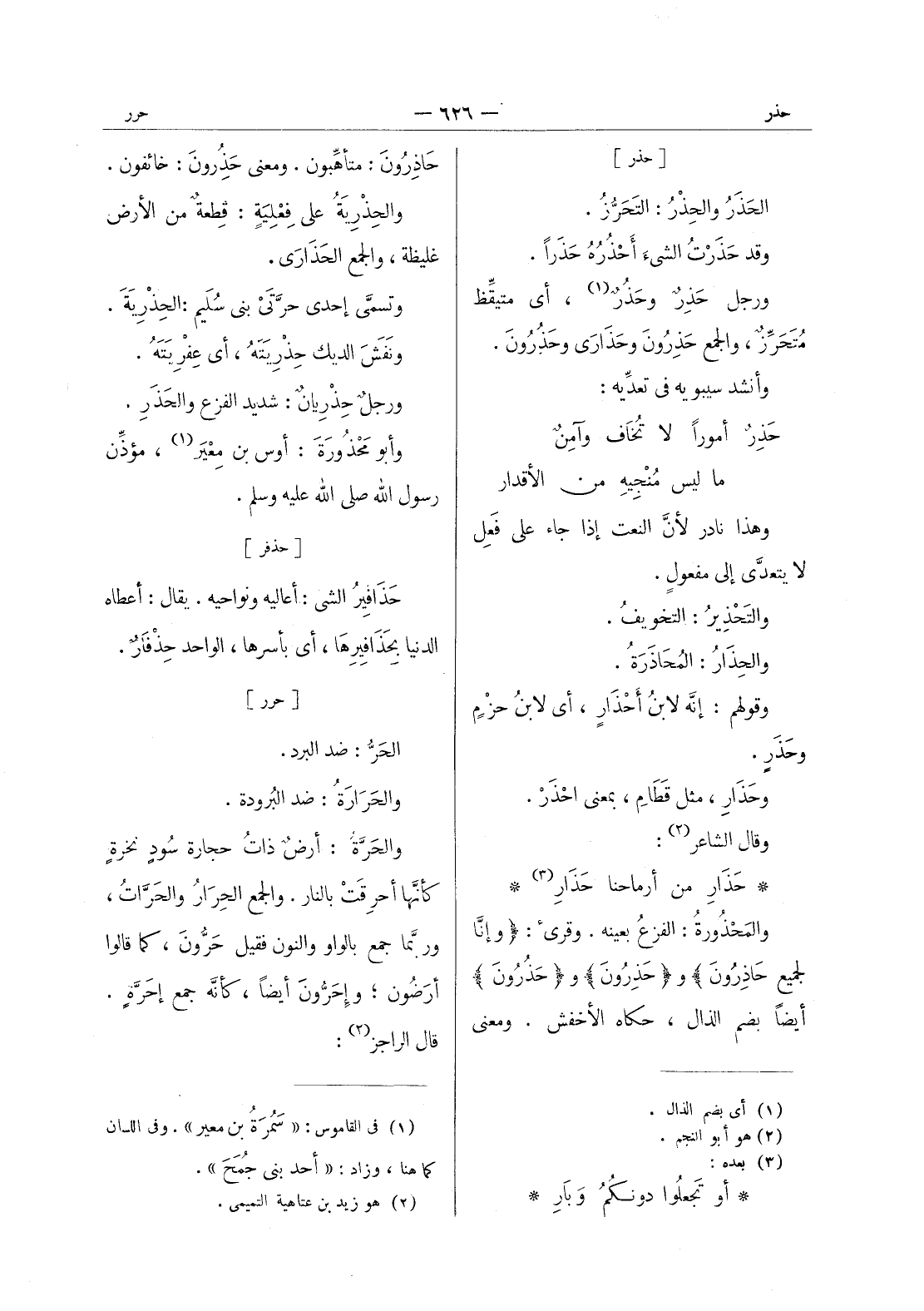 [حذر] الحَذَرُ والحِذْرُ: التَحَرُّزُ. وقد حذرت الشئ أحذره حذرا. ورجل حذر وحذر (¬1) ، أي متيقظ متحرز، والجمع حَذِرونَ وحَذارى وحَذُرونَ. وأنشد سيبويه في تعديه: حذرا أمورا لا تُخاف وآمِنٌ * ما ليس مُنْجيهِ من الاقدار - وهذا نادر لان النعت إذا جاء على فعل لا يتعدى إلى مفعول. والتحذير: التخويف. والحذار: المُحاذَرَةُ. وقولهم: إنَّه لابنُ أَحْذارٍ، أي لابنُ حزْمٍ وحَذرٍ. وحَذارِ، مثل قطام، بمعنى احْذَرْ. وقال الشاعر (¬2) :