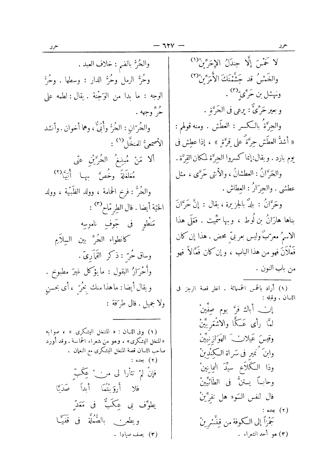 والحر بالضم: خلاف العبد. وحُرُّ الرمل وحَرُّ الدار: وسطها. وحر الوجه: مابدا من الوَجْنَةِ. يقال: لطمه على حر وجهه. والحران: الحر وأبى، وهما أخوان. وأنشد الاصمعي للمنخل (¬1) : ألا من مبلغ الحرين عنى * مغلغلة وخص بها أبيا (¬2) - والحر: فرخ الحمامة، وولد الظَبْية، وولد الحيّة أيضاً. قال الطرماح (¬3) : منطو في جوف ناموسه * كانطواء الحر بين السلام - وساق حُرٍّ: ذكر القَمارِيّ. وأَحْرارُ البقول: ما يؤكل غيرَ مطبوخ. ويقال أيضاً: ما هذا منك بِحُرٍّ، أي بحسنٍ ولا جميل. قال طرفة: