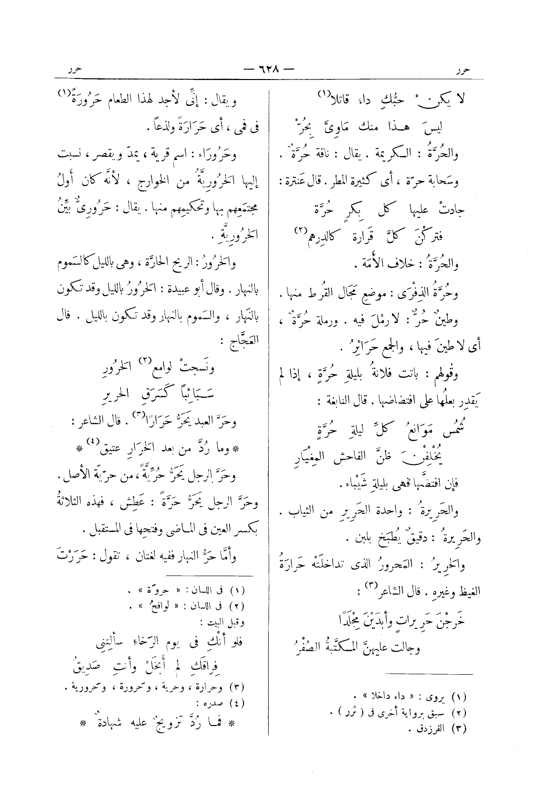 لا يكن حبك داءً قاتلاً (¬1) * ليسَ هذا منك ماوِيَّ بِحُرّْ - والحُرَّةُ: الكريمة. يقال: ناقة حُرَّةٌ. وسَحابة حرّة: أي كثيرة المطر. قال عَنترة. جادتْ عليها كل بِكرٍ حُرَّة * فتركنَ كلَّ قرارة كالدِرهم (¬2) - والحُرَّةُ: خلاف الأَمَة. وحُرَّةُ الذِفْرى: موضِع مَجال القُرط منها. وطينٌ حُرٌّ: لا رمْلَ فيه ورملة حُرَّةٌ، أي لا طينَ فيها، والجمع حَرائِرُ. وقولهم: باتت فلانةُ بليلةِ حُرَّةٍ، إذا لم يَقدِر بعلُها على افتضاضها. قال النابغة: شُمُس مَوانعُ كلِّ ليلةِ حُرَّةٍ * يُخْلِفْنَ ظنَّ الفاحش المغيار - فإن افتضها فهى بليلة شيباء. والحريرة: واحدة الحرير من الثياب. والحَريرةُ: دقيقٌ يُطْبَخ بلبن. والحَريرُ: المَحرورُ الذي تداخلَتْه حرارة الغيظ وغيره. قال الشاعر (¬3) : خرجن حريرات وأبدين مجلدا * وجالت عليهن المكتبة الصفر -