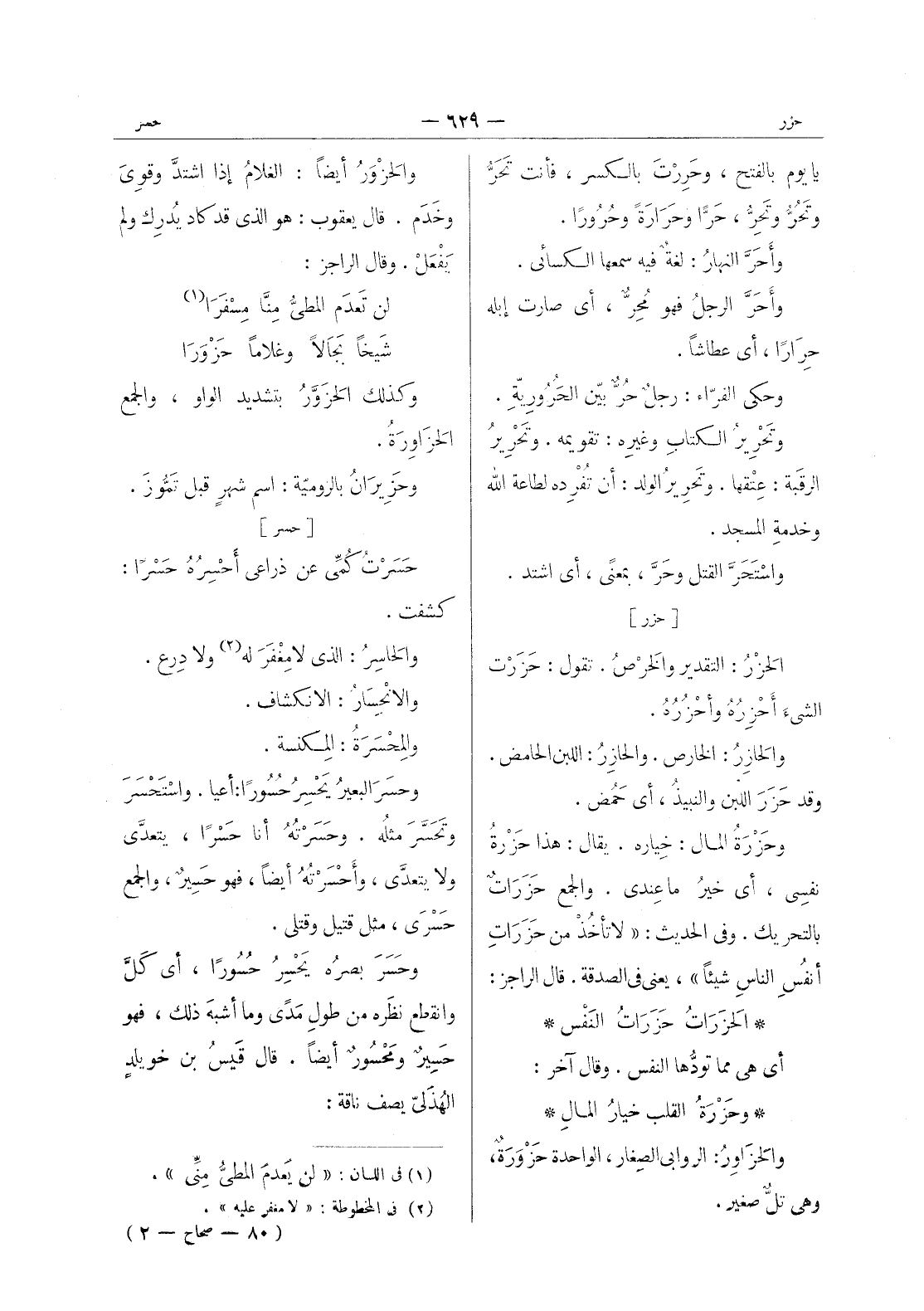 [حسر] حَسَرْتُ كُمِّي عن ذراعي أًحْسِرُهُ حَسْراً: كشفت. والحاسِرُ: الذي لا مِغْفَرَ له (¬2) ولا دِرع. والانْحِسارُ: الانكشاف. والمِحْسَرَةُ: المِكْنَسَةُ. وحسَرَ البعيرُ يَحْسِرُ حُسوراً: أعيا واسْتَحْسَرَ وتَحَسَّرَ مثلُه. وحَسَرْتُهُ أنا حَسْراً، يتعدَّى ولا يتعدَّى، وأَحْسَرْتُهُ أيضاً، فهو حسير، والجمع حسرى، مثل قتيل وقتلى. وحسر بصرُه يَحْسِرُ حُسوراً، أي كَلَّ وانقطع نظَره من طولٍ مَدىً وما أشبهَ ذلك، فهو حَسيرٌ ومحسور أيضا. قال قيس بن خويلد الهذلى يصف ناقة: