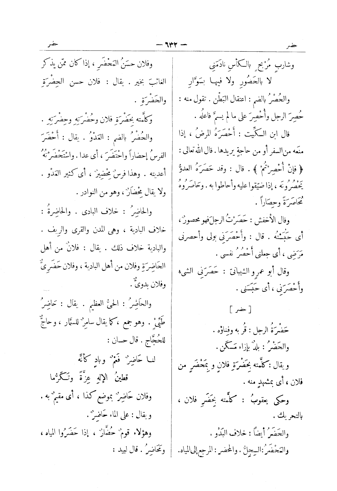 وشاربٍ مُرْبِحٍ بالكأْسِ نادَمَني * لا بالحصور ولا فيها بسَوَّارِ - والحُصْرُ بالضم: اعتقال البَطْن. تقول منه: حُصِرَ الرجل وأُحْصِرَ على ما لم يسمَّ فاعلُه. قال ابن السكِّيت: أَحْصَرَهُ المرضُ، إذا منَعه من السفر أو من حاجةٍ يريدها. قال الله تعالى: