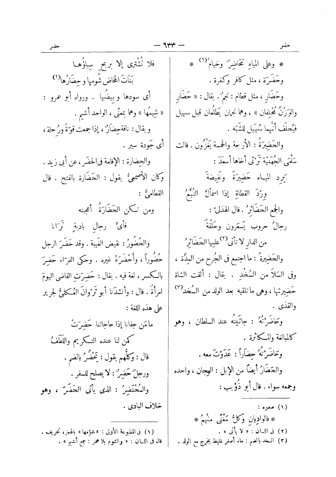 * وعلى المياهِ مَحاضِرٌ وخيامُ (¬1) * وحَضَرَة، مثل كافر وكفرة. وحَضارِ، مثل قطام: نجمٌ. يقال: " حَضارِ والوَزْنُ مُحْلِفان "، وهما نجمان يَطلُعان قبل سهيل فيُحلَف أنَّهما سُهَيل للشَبَه. والحَضيرَةُ: الأربعة والخمسة يَغْزُون. قالت سَلْمى الجُهَنيّة تَرْثي أخاها أسعَدَ: يَرِد المياه حضيرَةً ونَفيضةً * وِرْدَ القطاةِ إذا اسمألَّ التُبَّعُ - والجمع الحَضائِرُ. قال الهذليّ: رجالُ حروب يَسْعَرون وحَلْقةٌ * من الدارِ لا تأتي (¬2) عليها الحَضائِرُ - والحَضيرةُ: ما اجتمع في الجُرح من المِدَّة، وفي السَلا من السُخْدِ. يقال: ألقت الشاة حَضيرتها، وهي ما تلقيه بعد الولد من السُخد (¬3) والقذى. وحاضَرْتُهُ: جاثَيتُه عند السلطان، وهو كالمبالغة والمكاثرة. وحاضَرْتُهُ حِضاراً: عَدَوْتَ معه. والحَضارُ أيضاً من الإبل: الهجان، واحده وجمعه سواء. قال أبو ذؤيب:
