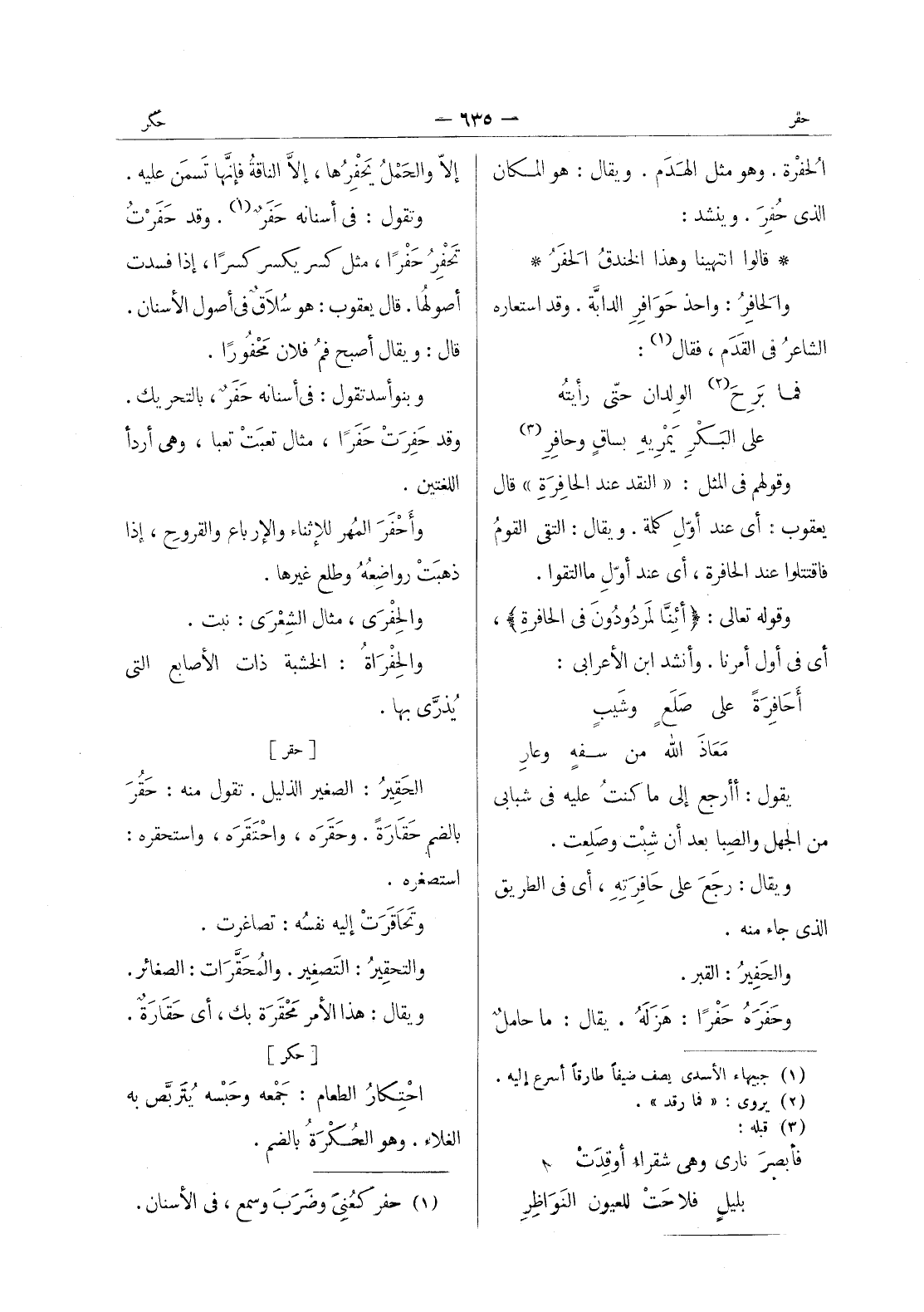 (أئِنَّا لَمردودونَ في الحافرةِ) *، أي في أول أمرنا. وأنشد ابن الأعرابي: أَحافرَةً على صَلَعٍ وشَيب * مَعاذَ الله من سفهٍ وعارِ - يقول: أأرجع إلى ما كنتُ عليه في شبابي من الجهل والصِبا بعد أن شِبْت وصَلِعت. ويقال: رجَعَ على حافِرَتِهِ، أي في الطريق الذي جاء منه. والحَفيرُ: القبر. وحَفَرَهُ حَفْراً: هزله. يقال: ما حامل