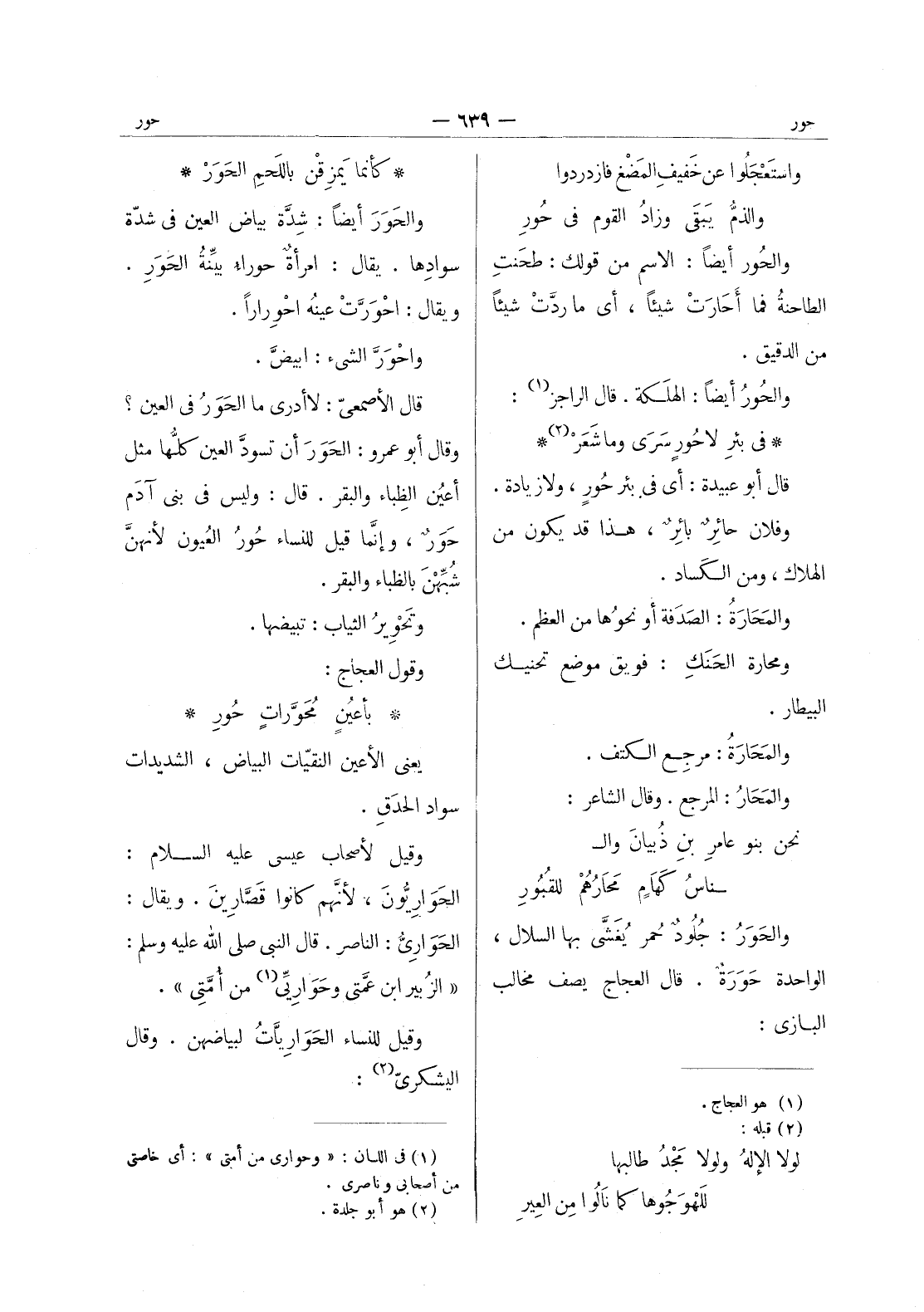 كأنما يَمزِقْن باللَحمِ الحَوَرْ * والحَوَرَ أيضاً: شِدَّةُ بياض العين في شدّة سوادِها. يقال: امرأةٌ حوراءُ بيِّنةُ الحَوَرِ. ويقال: احْوَرَّتْ عينهُ احورارا. واحور الشئ: ابيض. قال الاصمعي: لا أدرى ما الحور في العين؟ وقال أبو عمرو: الحور أن تسود العين كلها مثل أعين الظباء والبقر. قال: وليس في بنى آدم حور، وإنما قيل للنساء حور العيون لانهن شبهن بالظباء والبقر. وتحوير الثياب: تبيضها. وقول العجاج: