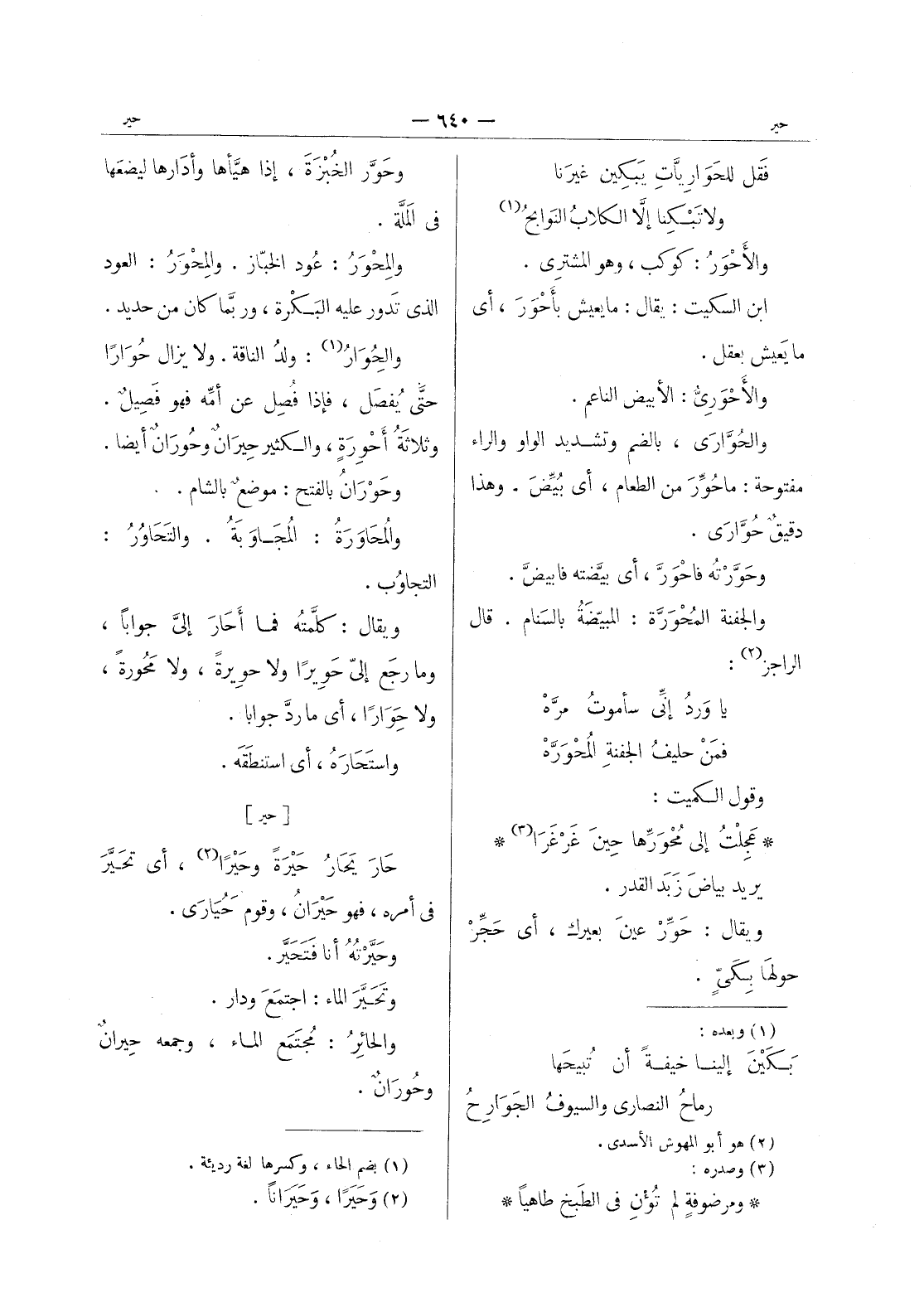 وحور الخُبْزَةَ، إذا هيَّأها وأدارها ليضَعها في المَلَّة. والمِحْوَرُ: عود الخبّاز. والمِحْوَرُ: العود الذي تَدور عليه البَكْرة، وربَّما كان من حديد. والحُِوَارُ (¬1) : ولدُ الناقة. ولا يزال حوارا حتى يفصل، فإذا فصل عن أمِّه فهو فَصيلٌ. وثلاثَةُ أَحْوِرَةٍ، والكثير حيرانٌ وحورانٌ أيضاً. وحوران بالفتح: موضع بالشام. والمُحَاوَرَةُ: المُجاوَبَةُ. والتَحاوُرُ: التجاوُب. ويقال: كلَّمتُه فما أحارَ إليَّ جواباً، وما رجَع إليّ حَويراً ولا حويرةً، ولا مَحورةً، ولا حِوَاراً، أي ما ردَّ جواباً. واستَحَارَهُ، أي استنقطه.
