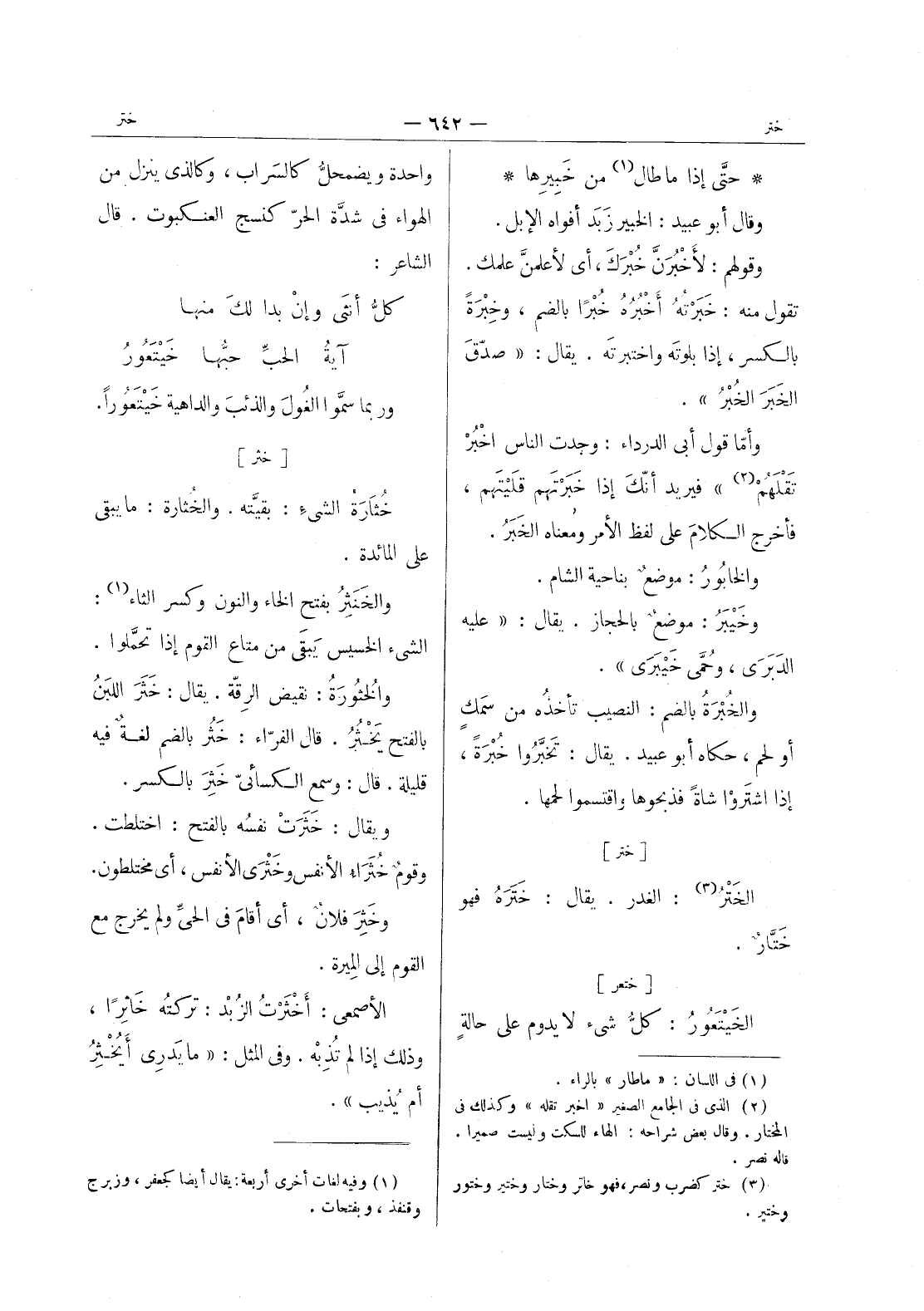 * حتَّى إذا ما طال (¬1) من خَبيرِها * وقال أبو عبيد: الخبير زَبَد أفواه الإبل. وقولهم: لأَخْبُرَنَّ خُبْرَكَ، أي لأعلمنَّ علمك. تقول منه: خَبَرْتُهُ أَخْبُرُهُ خُبْراً بالضم، وخِبْرَةً بالكسر، إذا بلوته واختبرتَه. يقال: " صدق الخبر الخبر ". وأما قول أبى الدرداء وجدت الناس اخبر تقلهم (¬2) " فيريد أنك إذا خبرتهم قليتهم، فأخرج الكلام على لفظ الامر ومعناه الخبر. والخابور: موضع بناحية الشام. وخبير: موضع بالحجاز. يقال: " عليه الدبرى، وحمى خيبرى ". والخبرة بالضم: النصيب تأخذُه من سَمكٍ أو لحم، حكاه أبو عبيد. يقال: تَخَبَّروا خُبْرَةً، إذا اشتَروْا شاة فذبحوها واقتسموا لحمها.