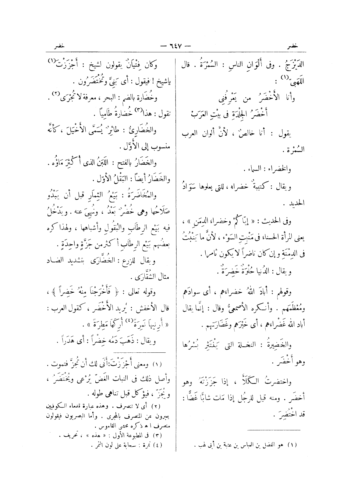 (فأَخْرَجْنا مِنْهُ خَضِراً) *، قال الأخفش: يريد الأَخْضَرَ، كقول العرب: " أرينها نمرة (¬4) أركها مطرة ". ويقال: ذَهَبَ دَمُه خِضْراً: أي هدرا.