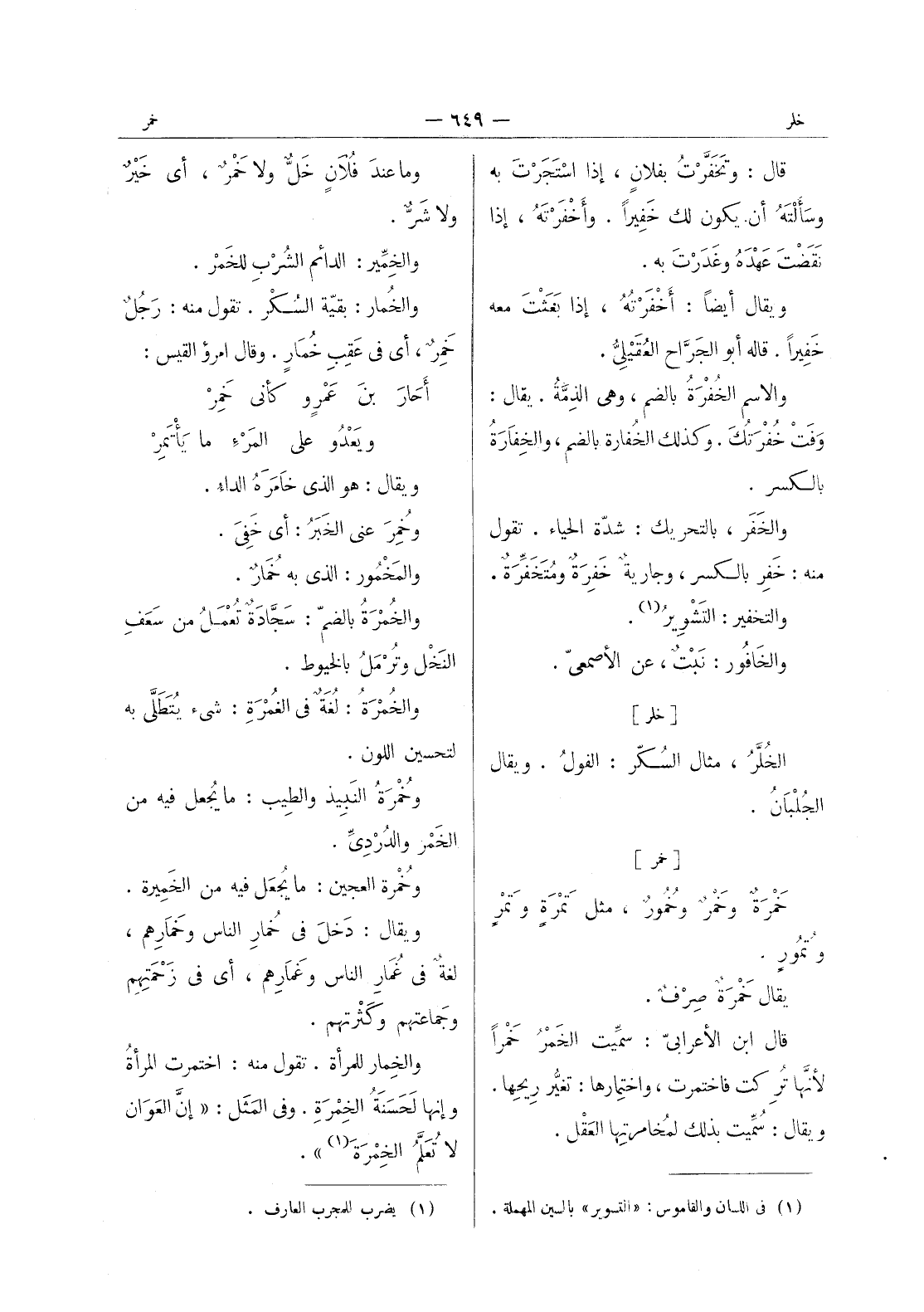 وما عند فُلانٍ خَلٌّ ولا خَمْرٌ، أي خَيْرٌ ولا شَرٌّ. والخِمِّير: الدائم الشُرْبِ للخَمْر. والخُمار: بقيّة السُكْر. تقول منه: رَجُلٌ خَمِرٌ، أي في عَقِبِ خُمارٍ. وقال امرؤ القيس: أَحارَ بنَ عَمْروٍ كأني خَمِرْ * ويَعْدو على المَرْءِ ما يَأْتَمِرْ - ويقال: هو الذي خامَرَهُ الداءُ. وخُمِرَ عني الخَبَرُ: أي خَفيَ. والمَخْمور: الذي به خُمارٌ. والخمرة بالضم: سجاد تعمل من سعف النخل وترمل بالخيوط. والخُمْرَةُ: لغة في الغمرة: شئ يتطلى به لتحسين اللون. وخُمْرَةُ النَبيذ والطيب: ما يُجعل فيه من الخَمْر والدُرْديِّ. وخُمْرَةُ العجين: ما يُجعل فيه من الخَميرة. ويقال: دَخلَ في خُمارِ الناس وخَمارِهم، لغةٌ في غَمارِ الناس وغَمارِهم، أي في زحمتهم وجماعتهم وكثرتهم. والخِمار للمرأة. تقول منه: اختمرت المرأة وإنها لحسنة الخمرة. وفى المثل: " إن العوان لا تعلم الخمرة (¬1) ".