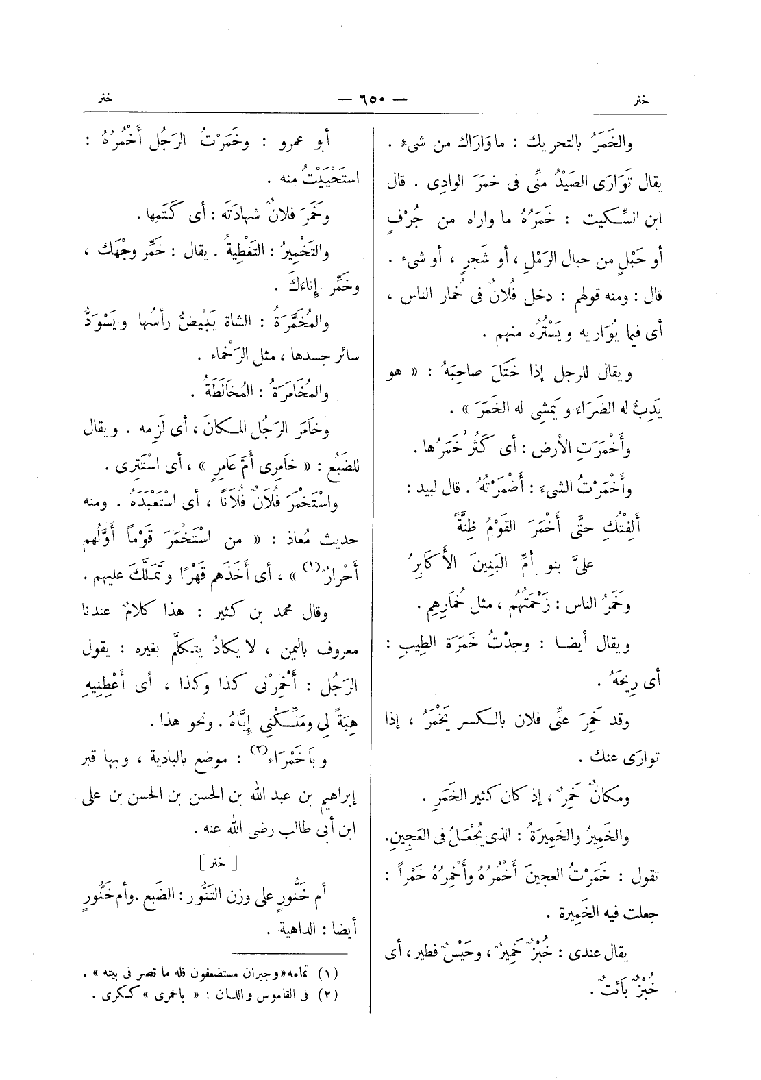 أبو عمرو: وخَمَرْتُ الرَجُل أَخْمُرُهُ: استَحْيَيْتُ منه. وخَمَرَ فلانٌ شهادَتَه: أي كَتَمها. والتَخْميرُ: التَغْطيةُ. يقال: خَمِّر وجْهَك، وخَمِّرْ إناءَكَ. والمُخَمَّرَةُ: الشاة يَبْيضُّ رأسُها ويَسْوَدُّ سائر جسدها، مثل الرَخْماء. والمُخامَرَةُ: المُخالَطَةُ. وخامَر الرجُل المكانَ، أي لَزِمَه. ويقال للضَبُع: " خامري أَمَّ عامِرٍ "، أي استَتري. واسْتَخْمَرَ فُلانٌ فُلاناً، أي اسْتَعْبَدَهُ. ومنه حديث مُعاذ: " من اسْتَخْمَرَ قوما أولهم أَحْرارٌ (¬1) "، أي أَخَذَهم قَهْراً وتَمَلَّكَ عليهم. وقال محمد بن كثير: هذا كلام عندنا معروف باليمن، لا يكادُ يتكلَّم بغيره: يقول الرَجُل: أَخْمِرْني كذا وكذا، أي أَعْطِنيهِ هِبَةً لي ومَلِّكْني إيَّاهُ. ونحو هذا. وباخمراء (¬2) : موضع بالبادية، وبها قبر إبراهيم بن عبد الله بن الحسن بن الحسن بن على ابن أبي طالب رضي الله عنه.