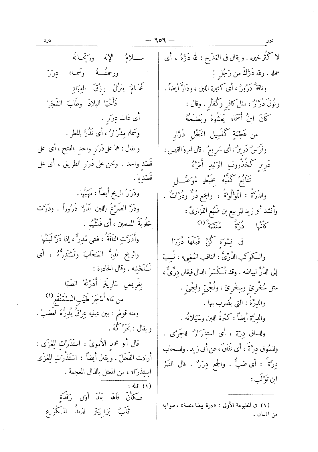 سلام الاله ورَيْحانُه * ورحمُتهُ وسَماءٌ دِرَرْ - غَمامٌ ينزِّلُ رِزْقَ العِبادِ * فَأَحْيا البلادَ وطابَ الشَجَر - أي ذات دِرَرٍ. وسَماءٌ مِدْرارٌ، أي تَدُرُّ بالمطر. ويقال: هما على دَرَرٍ واحدٍ بالفتح، أي على قَصْدٍ واحد. ونحن على دَرَرِ الطريق، أي على قَصْدِهِ. ودَرَرُ الريح أيضاً: مهبها. ودرالضرع اللبن يدر دُروراً. ودَرَّت حَلوبَةُ المسلمين أي فَيْئُهُم. وأَدَرَّتِ الناقَةُ، فهي مُدِرٌّ، إذا دَرَّ لَبَنُها والريح تُدِرُّ السَحابَ وتَسْتَدِرُّهُ، أي تَسْتَحْلِبُهُ. وقال الحادرة: بِغرِيضِ سارِيَةٍ أَدَرَّتْهُ الصَبا * من ماءِ أَسْجَرَ طَيِّبِ المُسْتَنْقَعِ (¬1) - ومنه قولهم: بين عينيه عِرْقٌ يدره العضب. ويقال: يحركه. قال أبو محمد الاموى: استدرت المعزى: أرادت الفحل. ويقال أيضا: استذرت المعزى استذراء، من المعتل بالذال المعجمة.