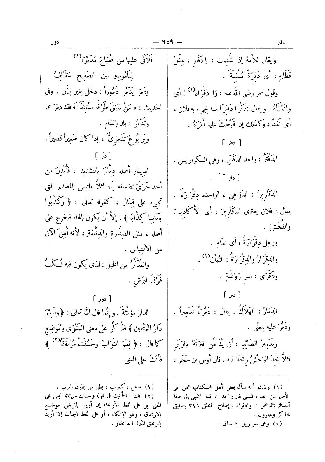 فلاقى عليها من صباح مدمرا (¬1) * لناموسه بين الصفيح سقائف - ودَمَرَ يَدْمُر دُموراً: دخلَ بغير إذْن. وفي الحديث: " مَنْ سَبَقَ طرفه استئذانه فقد دمر ". وتدمر: بلد بالشام. ويربوع تَدْمُريٌّ، إذا كان صغيراً قصيراً.