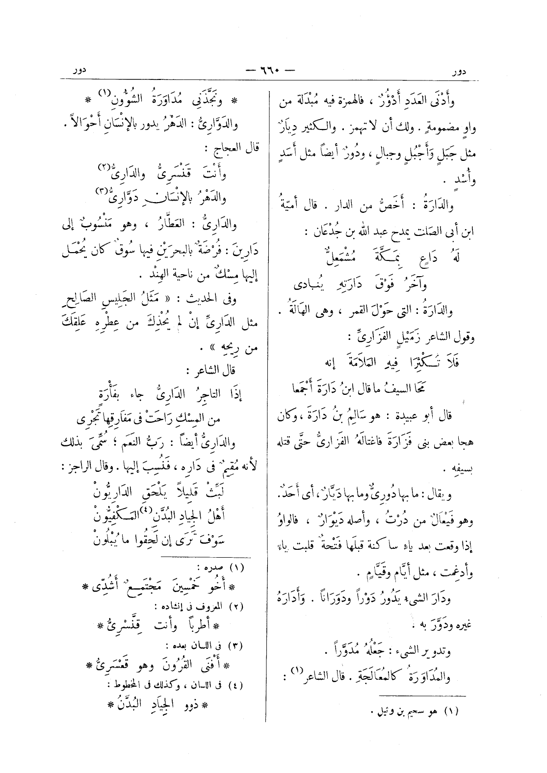 وأدنى العدد أدؤر، فالهمزة فيه مبدلة من واو مضمومة. ولك أن لا تهمز. والكثير ديار مثل جبل وأجبل وجبال. ودور أيضا مثل أسد وأسد. والدارة: أَخَصُّ من الدار. قال أميَّةُ ابن أبى الصلت يمدح عبد الله بن جُدْعان: لَهُ داعٍ بِمَكَّةَ مُشْمَعِلٌّ * وآخَرُ فَوْقَ دارَتِهِ يُنادي - والدارَةُ: التي حَوْلَ القمر، وهى الهالة. وقول الشاعر زميل الفزارى: فلا تكثرا فيه الملامة إنه * محا السيف ما قال ابن دارة أجمعا - قال أبو عبيدة: هو سالم بن دارة، وكان هجا بعض بنى فزارة فاغتاله الفزارى حتى قتله بسيفه. ويقال: ما بها دُوريٌّ وما بها دَيَّارٌ، أي أَحَدٌ. وهو فَيْعالٌ من دُرْتُ، وأصله ديوار، فالواو إذا وقعت بعد ياء ساكنة قبلها فتحة قلبت ياء وأدغمت، مثل أيام وقيام. ودار الشئ يدور دَوْراً ودَوَراناً. وأَدارَهُ غيره ودَوَّرَ به. وتدوير الشئ: جعله مدورا. والمداورة كالمعالجة. قال الشاعر (¬1) :