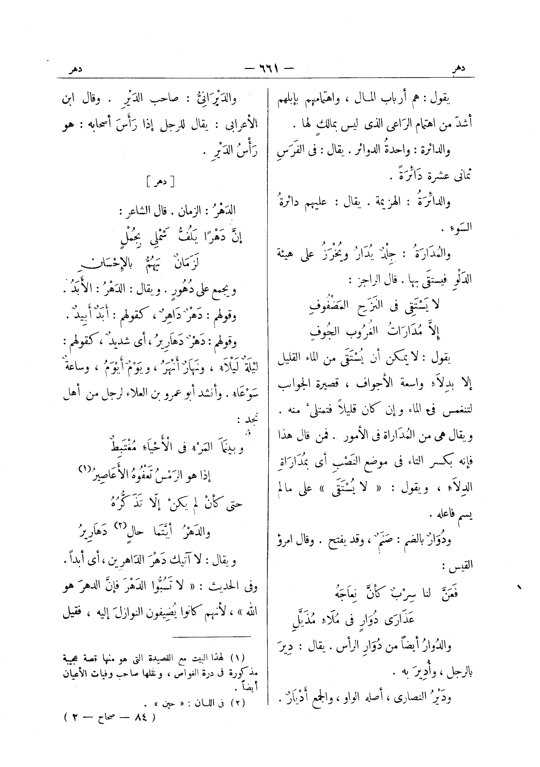 يقول: هم أرباب المال، واهتمامهم بإبلهم أشد من اهتمام الراعى الذى ليس بمالك لها. والدائرة: واحدةُ الدوائر. يقال: في الفرس ثماني عشرة دائرة. والدائرة: الهزيمة. يقال: عليهم دائرةُ السَوءِ. والمُدارَةُ: جِلْدٌ يُدارُ ويُخْرَزُ على هيئة الدلو فيستقى بها. قال الراجز: لا يستقى في النزح المضفوف * إلا مدارات الغروب الجوف - يقول: لا يمكن أن يستقى من الماء القليل إلا بدلاء واسعة الاجواف، قصيرة الجوانب لتنغمس في الماء وإن كان قليلا فتمتلئ منه. ويقال هي من المدارة في الامور. فمن قال هذا فإنه بكسر التاء في موضع النصب أي بمدارة الدلاء، ويقول: " لا يستقى " على ما لم يسمَّ فاعلُه. ودوار بالضم: صَنَمٌ، وقد يفتح. وقال امرؤ القيس: فَعَنَّ لنا سِربٌ كأنَّ نِعاجَهُ * عَذارى دُوارٍ في مُلاءٍ مُذَيَّلِ - والدُوارُ أيضاً من دُوارِ الرأس. يقال: دِيرَ بالرجل، وأُديرَ به. ودَيْرُ النصارى، أصله الواو، والجمع أديار.