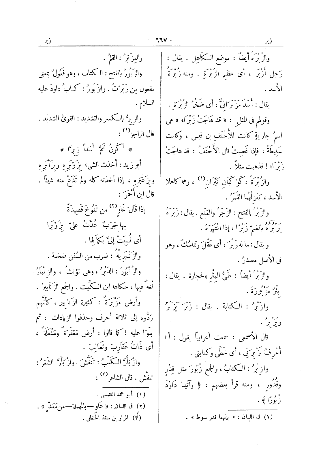 والزبرة أيضا: موضع الكَاهِل. يقال: رَجل أَزْبَر، أي عظيم الزُبْرَةِ. ومنه زُبْرَةُ. الأسد. يقال: أَسَدٌ مَزْبَرَانيٌّ، أي ضخم الزبرة. وقولهم في المثل: " قد هاجت زبراء " هي اسم جارية كانت للاحنف بن قيس، وكانت سليطة، فإذا غضبت قال الاحنف: قد هاجت زبراء! فذهب مثلا. والزبرة: كوكبان نيران (¬1) ، وهما كاهلا الأسد، يَنزِلُهُما القَمَرُ. والزَبْرُ بالفتح: الزَجرُ والمَنْع. يقال: زبره يزبره بالضم زبرا، فإذا انتهره. ويقال: ما له زبر، أي عَقْلٌ وتماسُكٌ، وهو في الأصل مصدرٌ. والزَبْرُ أيضاً: طَيُّ البِئْرِ بالحجارة. يقال: بئْرٌ مَزْبورَةٌ. الزبر: الكتابة. يقال: زبر يزبر ويَزْبِرُ. قال الأصمعي: سمعت أعرابياً يقول: أنا أَعْرِفُ تَزْبِرَتي، أي خَطِّي وكتابتي. والزِبْرُ: الكتابُ، والجمع زبور مثل قدر وقدور، منه قرأ بعضهم: