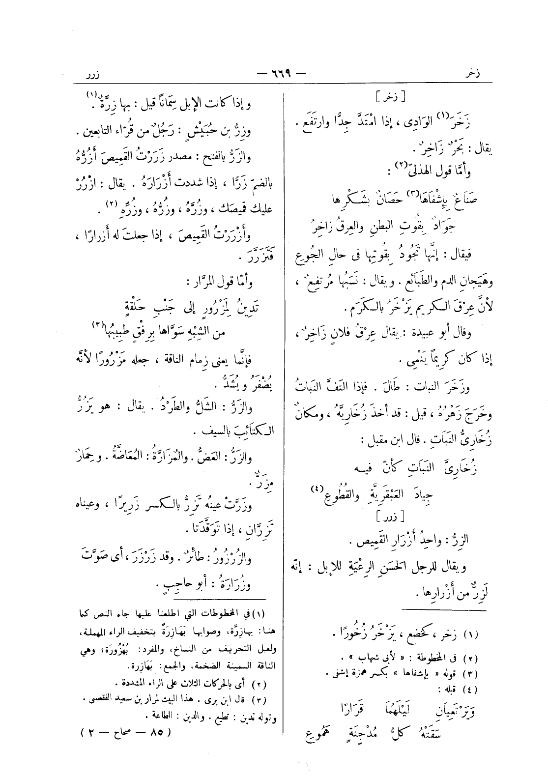 [زخر] زَخَرَ (¬1) الوادي، إذا امْتَدَّ جِدّاً وارتَفَع. يقال: بَحْرٌ زاخِرٌ. وأما قول الهُذَليّ (¬2) : صَناعٌ بإِشْفاها (¬3) حَصانٌ بِشَكْرِها * جَوادٌ بِقوتِ البَطْنِ والعِرْقُ زاخِرُ - فيقال: إنها تجود بِقُوتِها في حالِ الجوعِ وهَيَجانِ الدم والطَبائع. ويقال، نَسَبُها مُرتفِعٌ، لأنَّ عِرْقَ الكريم يَزْخَرُ بالكَرَم. وقال أبو عبيدة: يقال عِرْقُ فلانٍ زاخِرٌ، إذا كان كرِيماً ينمى. وزخر البنات: طال. فإذا التَفَّ النَباتُ وخَرجَ زَهْرُهُ، قيل: قد أخذَ زُخَارِيَّهُ، ومكانٌ زُخارِيُّ النَباتِ. قال ابن مقبل: زُخارِيُّ النَباتِ كأنّ فيه * جِيادَ العَبْقَرِيّةِ والقطوع (¬4) -
