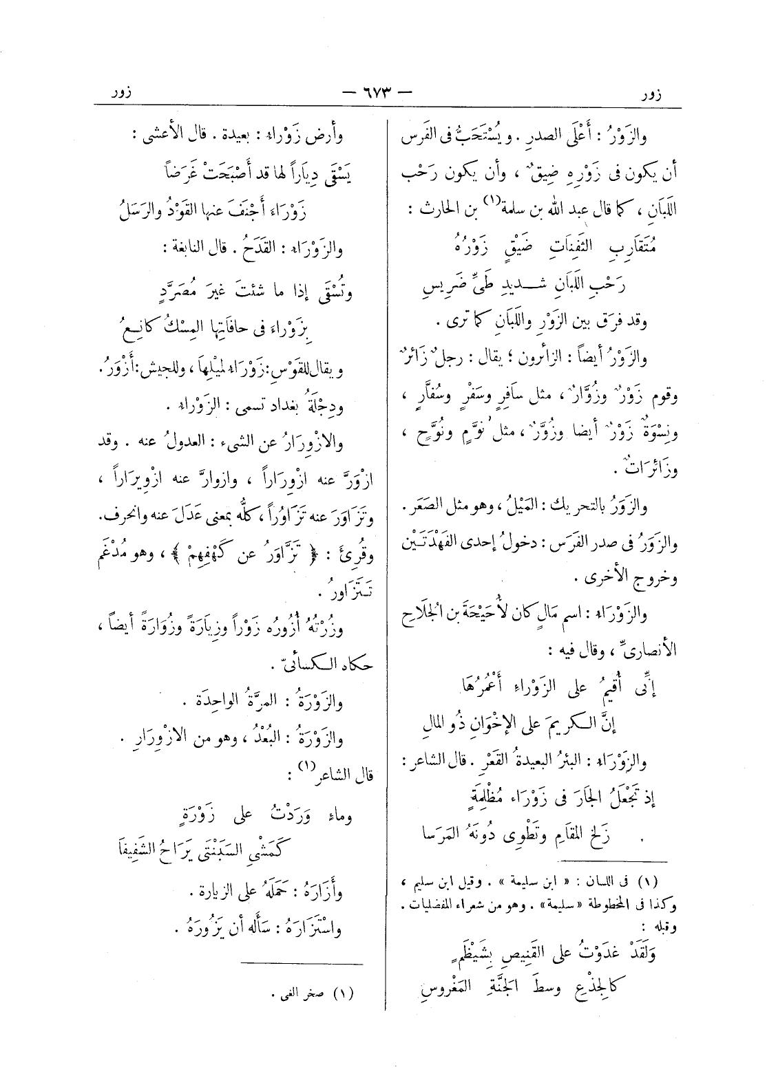 والزور: أَعْلَى الصَدرِ. ويُسْتَحَبُّ في الفَرس أن يكون في زَوْرِهِ ضيقٌ، وأن يكون رَحْب اللَبانِ، كما قال عبد الله بن سلمة (¬1) بن الحارث: مُتَقارِبِ الثَفِناتِ ضَيْقٍ زَوْرُهُ * رَحْبُ اللَبانِ شديدِ طَيِّ ضَريسِ - وقد فرَق بين الزَوْرِ واللَبانِ كما ترى. والزَوْرُ أيضاً: الزائرون، يقال: رجلٌ زائرٌ وقوم زور وزوار، مثل سافر وسفر وسفار، ونسوة زور أيضا وزور، مثل نوم ونوح، وزائرات. والزور بالتحريك: الميل، وهو الصعر. والزور في صدر الفَرَس: دخولُ إحدى الفَهْدَتَيْن وخروج الاخرى. والزوراء: اسم مال كان لاحيحة بن الجلاح الانصاري، وقال فيه: إنى أقيم على الزوراء أعمرها * إن الكريم على الاخوان ذو المال - والزوراء: البئر البعيدة العقر. قال الشاعر: إذ تجعل الجارَ في زَوْراء مُظْلِمَةٍ * زَلخ المقام وتطوى دونه المرسا -