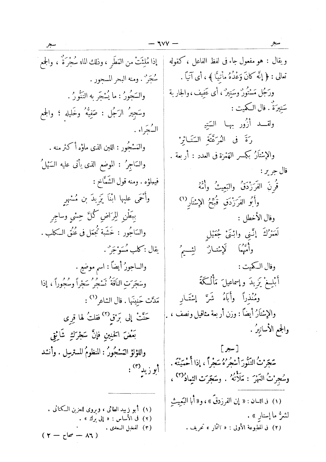 إذا ملئت من المَطَرِ، وذلك الماءُ سُجْرَةٌ، والجمع سُجَر. ومنه البحر المسَجور. والسَجورُ: ما يُسْجَر به التَنُّورُ. وسَجيرُ الرَجُل: صَفِيُّهُ وخَليله، والجمع السُجَراء. والمَسْجور: اللبن الذي ماؤه أكثر منه. والساجِرُ: الموضع الذي يأتي عليه السيل فيملؤه. ومنه قول الشماخ: وأحمى عليها ابنا يزيد بن مسهر * ببطن المراض كل حسى وساجر - والساجور: خشبة تُجْعَلُ في عُنُقِ الكلب. يقال: كلب مسوجر. والساجور أيضا: اسم موضع. وسجرت الناقة تسجر سَجْراً وسُجوراً، إذا مَدَّت حَنينَها. قال الشاعر (¬1) : حَنَّتْ إلى بَرْقٍ (¬2) فقلتُ لها قِرى * بَعْضَ الحَنينِ فإنَّ سَجْرَكِ شائِقي - واللؤلؤ المَسْجورُ: المنظومُ المسترسِل. وأنشد أبو زيد (¬3) :