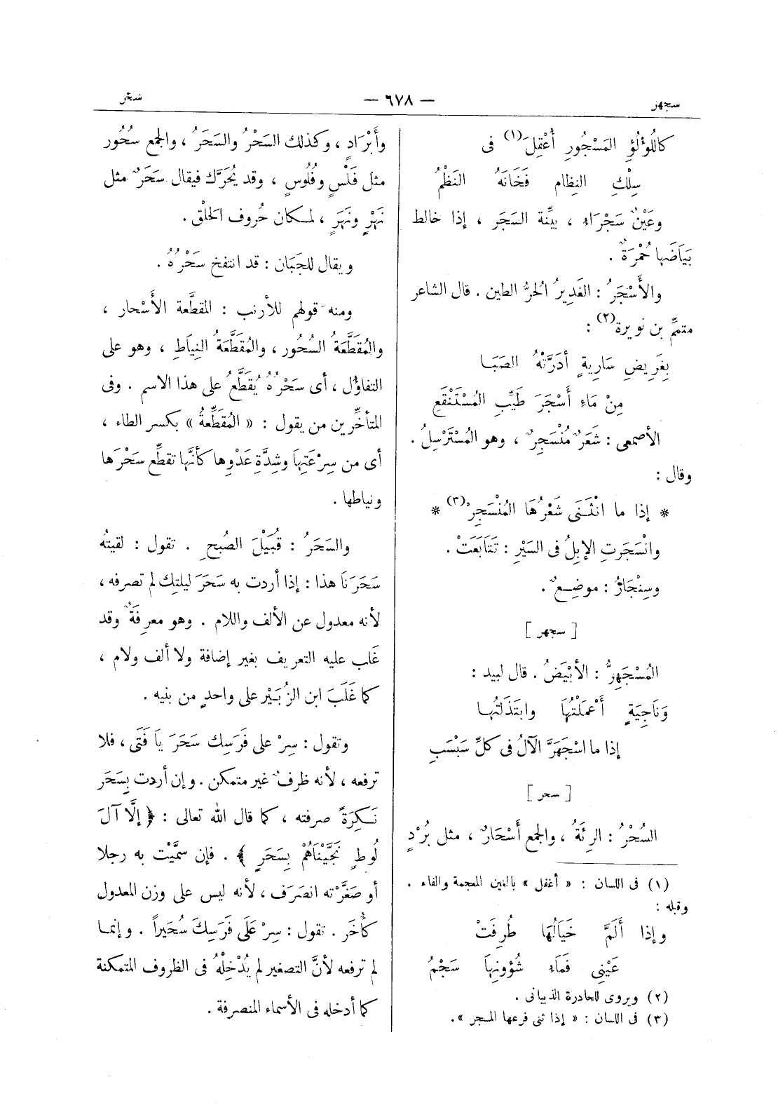 وأبراد، وكذلك السَحْرُ والسَحَرُ، والجمع سُحور مثل فلس وفلوس، وقد يحرك فيقال سحر مثل نهر ونهر، لمكان حروف الحلق. ويقال للجَبان: قد انتفخ سَحْرُهُ. ومنه قولهم للأرنب: المقطَّعة الأسْحار، والمُقَطَّعَةُ السُحور، والمُقَطَّعَةُ النِياطِ، وهو على التفاؤُل، أي سَحْرُهُ يُقَطَّعُ على هذا الاسم. وفي المتأخِّرين من يقول: " المُقَطِّعةُ " بكسر الطاء، أي من سرعتها وشدة عدوها كأنَّها تقطِّع سِحْرَها ونياطها. والسَحَرُ: قبيل الصبح. تقول: لقيته سحرنا هذا: إذا أردت به سحر ليلتك لم تصرفه، لانه معدول عن الالف واللام. وهو معرفة وقد غلب عليه التعريف بغير إضافة ولا ألف ولام، كما غلب ابن الزبير على واحد من بنيه. وتقول: سر على فرسك سحر يافتى، فلا ترفعه، لانه ظرف غير متمكن. وإن أردت بسحر نكرة صرفته، كما قال الله تعالى: