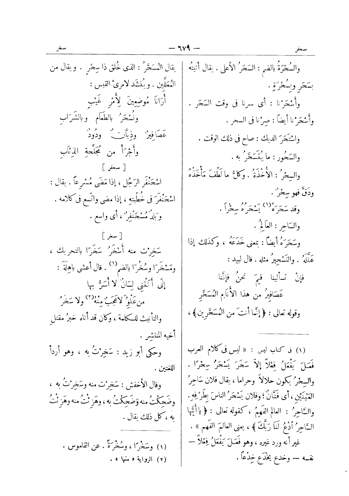 (¬1) في كتاب ليس: " ليس في كلام العرب فعل يفعل فعلا إلا سحر يسحر سحرا. والسحر يكون حلالا وحراما. يقال فلان ساحر العينين، أي فتان، وفلان يسحر الناس بطرفه. والساحر: العالم الفهم، كقوله تعالى: