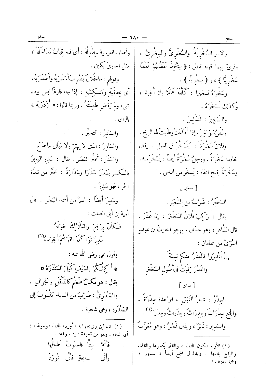 وأصله بالفارسية سه دلة: أي فيه قِبابٌ مُداخَلَةٌ، مثل الحاريّ بكمين. وقولهم: جاء فُلانٌ يَضْرِبُ أَسْدَرَيْه وأَصْدَرَيْه، أي عِطْفَيْهِ ومَنْكِبَيْهِ، إذا جاء فارغاً ليس بيده شئ ولم يقض طلبته. وربما قالوا: " أزدريه ". بالزاى. والسادر: المتحير. والسادر: الذى لا يهتمّ ولا يُبالي ما صَنَع. والسَدَر: تَحيُّر البَصَر. يقال: سَدِر البَعيرُ بالكسر يَسْدَرُ سَدَراً وسَدارَةً: تحيَّر من شدَّة الحر، فهو سَدِرٌ. وسَدِرٌ أيضاً: اسمٌ من أسماء البَحْر. قال أمية بن أبي الصلت: فكأنّ بِرْقِعَ والمَلائِكَ حوله * سدر تواكله القوائم أجرب (¬1) - وقول على رضى الله عنه: