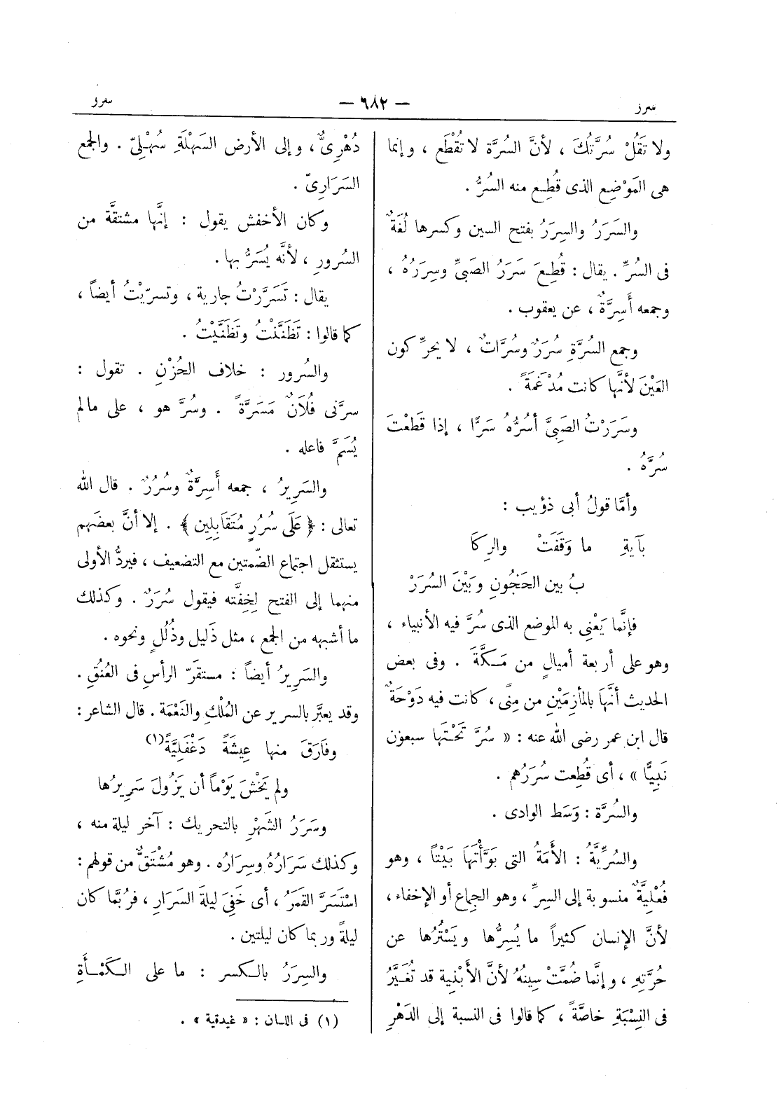 ولا تقل سرتك، لأنَّ السُرَّة لا تُقْطَعُ، وإنما هي المَوْضِعُ الذي قُطِعَ منه السُرُّ. والسَرَرُ والسِرَرُ بفتح السين وكسرها لُغَةٌ في السُرِّ. يقال: قُطِعَ سَرَرُ الصَبيِّ وسِرَرُهُ، وجمعه أسرة، عن يعقوب. وجمع السرة سرر وسرات، لا يحركون العين لانها كانت مدغمة. وسَرَرْتُ الصَبِيَّ أَسُرُّهُ سَرَّاً، إذا قطعت سره. وأما قول أبى ذؤيب. بآية ما وقفت والركا * ب بين الحجون وبين السرر - فإنما يعنى به الموضع الذى سر فيه الانبياء، وهو على أربعة أميال من مكة. وفى بعض الحديث أنها بالمأزمين من منى، كانت فيه دوحة قال ابن عمر رضى الله عنه: " سر تحتها سبعون نبيا "، أي قطعت سررهم. والسرة: وسط الوادي. والسُرِّيَّةُ: الأَمَةُ التي بَوَّأتَها بَيْتاً، وهو فعلية منسوبة إلى السر، وهو الجماع أو الاخفاء، لان الانسان كثيرا ما يسرها ويسترها عن حرته، وإنما ضمت سينه لان الابنية قد تغير في النسبة خاصة، كما قالوا في النسبة إلى الدهر
