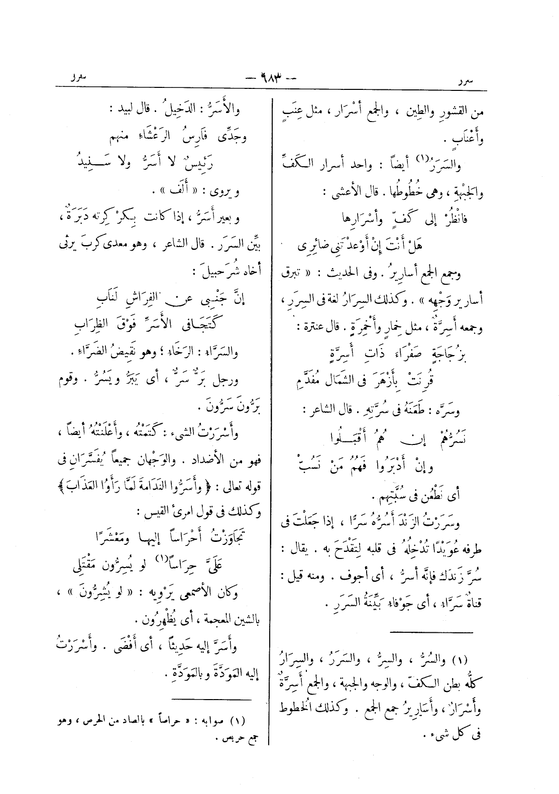 (وأَسَرَّوا النَدامةَ لَمَّا رَأَوْا العَذابَ) * وكذلك في قول امرئ القيس: تجاوزت أحراسا إليها ومعشرا * على حراسا (¬1) لو يسرون مقتلي - وكان الاصمعي يرويه، " لو يشرون "، بالشين المجعمة، أي يظهرون. وأَسَرَّ إليه حَدِيثاً، أي أَفْضَى. وأسررت إليه المودة وبالمودة.
