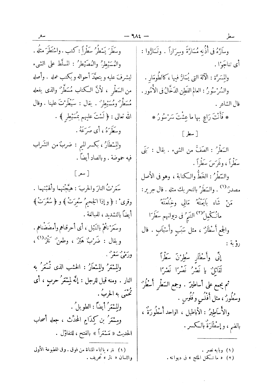 [سطر] السطر: الصف من الشئ. يقال: بَنى سَطْراً، وغَرَسَ سَطْراً. والسَطْرُ: الخَطُّ والكتابة، وهو في الأصل مصدرٌ (¬1) . والسَطَرُ بالتحريك مثله. قال جرير: مَنْ شاَء بايَعْتُهُ مالي وخُِلْعَتَهُ * ما تُكْمِلُ (¬2) التَيمُ في ديوانهم سَطَرا - والجمع أَسْطارٌ، مثل سبب وأسباب. قال رؤبة: إنى وأسْطارٍ سُطِرْنَ سَطرا * لَقائلٌ يا نصر نصرا نَصْراً - ثم يجمع على أساطيرَ. وجمع السطر أسطر وسطور، مثل أفلس وفلوس. والاساطير: الأباطيل، الواحد أُسْطورَةٌ، بالضم، وإسْطارَةٌ بالكسر.