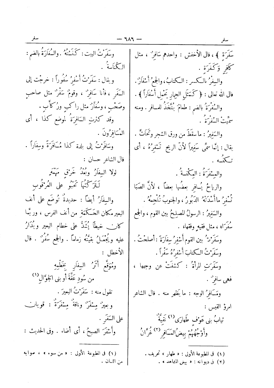 (كَمَثَلِ الحِمارِ يَحْمِلُ أَسْفاراً) *. والسُفْرَةُ بالضم: طعامٌ يُتَّخَذُ للمسافر. ومنه سمِّيَتْ السُفْرَةُ. والسَفيرُ: ما سقَطَ من ورق الشجر وتَحاتَّ. يقال: إنَّما سمِّي سَفيراً لأنّ الريح تَسْفِرُهُ، أي تكنُسه. والمِسْفَرَةُ: المِكْنسةُ. والرياحُ يُسافِر بعضُها بعضاً، لأنَّ الصَّبا تُسْفِرُ ما أَسْدَتْهُ الدَبورُ، والجنوبُ تُلْحِمُهُ. والسَفيرُ: الرسولُ المصلِحُ بين القوم، والجمع سفراء، مثل فقيه وفقهاء. وسفرت بين القوم أَسْفِرُ سِفارَةً: أصلحْتُ. وسَفَرْتُ الكتابَ أَسْفِرُهُ سَفْراً. وسَفَرَتِ المرأةُ: كشفَتْ عن وجهها، فهي سافِرٌ. ومَسافِرُ الوجه: ما يَظهر منه. قال الشاعر امرؤ القيس: ثيابُ بني عَوْفٍ طَهارى (¬1) نَقِيَّةٌ * وأوجههم بيض المسافر (¬2) غران -