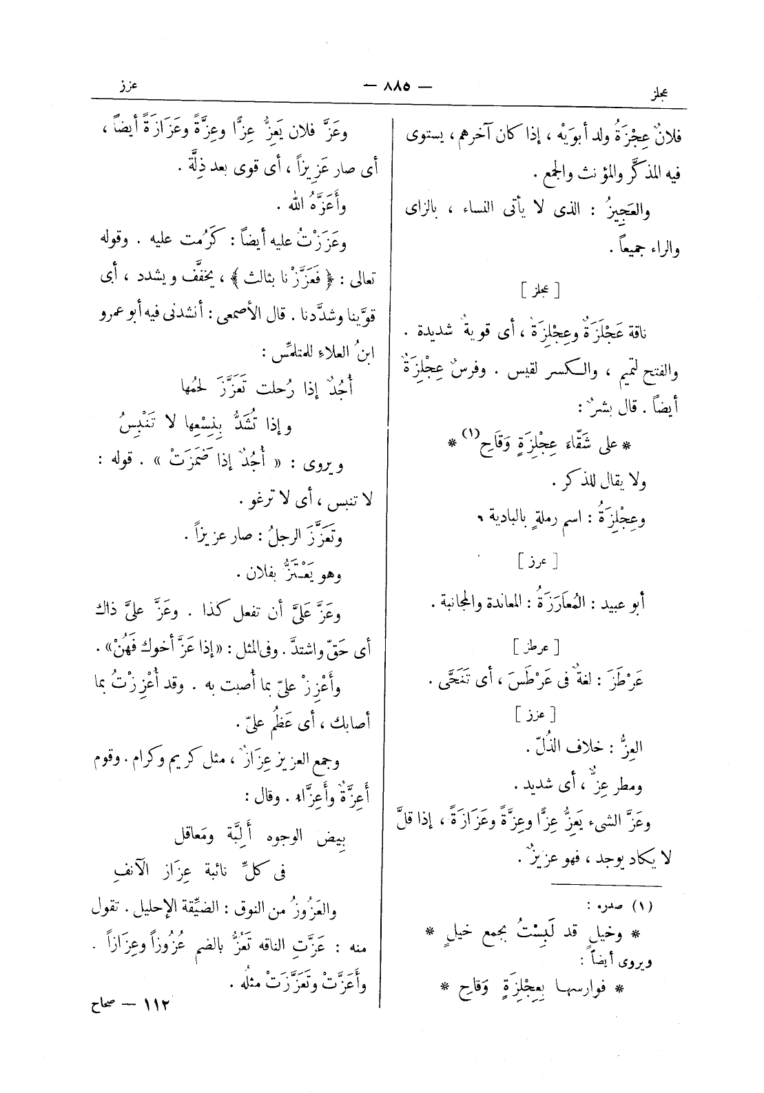 وعز فلان يعز عزا وعِزَّةً وعَزازَةً أيضاً، أي صار عَزيزاً، أي قوي بعد ذِلَّة. وأعَزَّهُ الله. وعَزَزْت عليه أيضاً: كَرُمت عليه. وقوله تعالى: {فَعَزَّزْنا بثالث} ، يخفَّف ويشدد، أي قوَّينا وشددنا. قال الاصمعي: أنشدني فيه أبو عمرو ابن العلاء للمتلمس: أجد إذا رحلت تعزز لحمها * وإذا تشد بنسعها لا تنبس * ويروى: " أجد إذا ضمزت ". قوله: لا تنبس، أي لا ترغو. وتعزز الرجل: صار عزيزا. وهو يَعْتَزُّ بفلان. وعَزَّ عليَّ أن تفعل كذا. وعَزَّ عليَّ ذاك أي حَقّ واشتدَّ. وفي المثل: " إذا عَزَّ أخوك فَهُنْ ". وأعْزِزْ عليّ بما أصبت به. وقد أُعْزِزْتُ بما أصابك، أي عَظُم عليّ. وجمع العزيز عِزازٌ، مثل كريم وكرام. وقوم أعزَّةٌ وأعِزَّاءُ. وقال: بيض الوجوه ألِبَّة ومَعاقل * في كلِّ نائبة عِزاز الآنفِ * والعَزوزُ من النوق: الضيِّقة الإحليل. تقول منه: عَزَّتِ الناقة تَعُزُّ بالضم عُزوزاً وعزازا. وأعزت وتعززت مثله.
