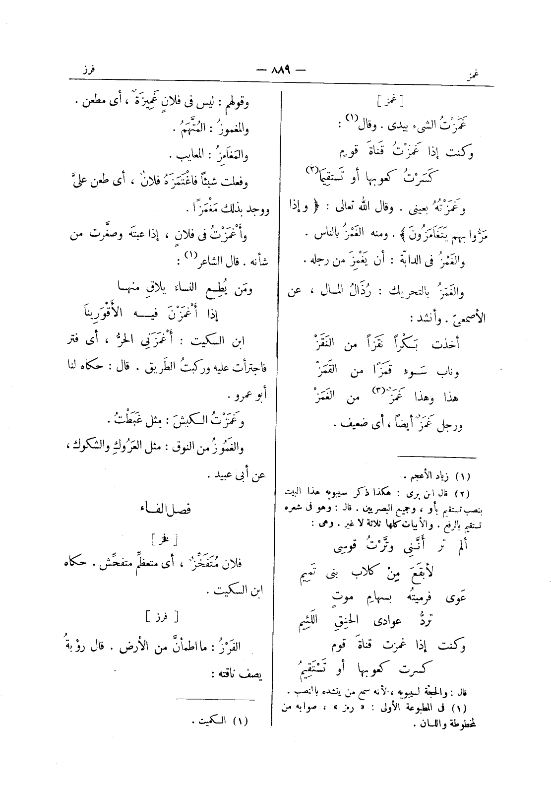 [غمز] غمزت الشئ بيدى. وقال (¬1) : وكنتُ إذا غَمَزْتُ قناةَ قومٍ * كَسَرْتُ كعوبها أو تستقيما (¬2) * وغَمَزْتُهُ بعينى. وقال الله تعالى: {وإذا مرُّوا بهم يَتَغامَزونَ} . ومنه الغَمْزُ بالناس. والغَمْزُ في الدابَّة: أن يَغْمِزَ من رجله. والغَمَزُ بالتحريك: رذال المال، عن الاصمعي. وأنشد: أخذت بكرا نقزا من النقز * وناب سوء قمزا من القمز * هذا وهذا غمز (¬3) من الغمز * ورجل غمز أيضا، أي ضعيف.