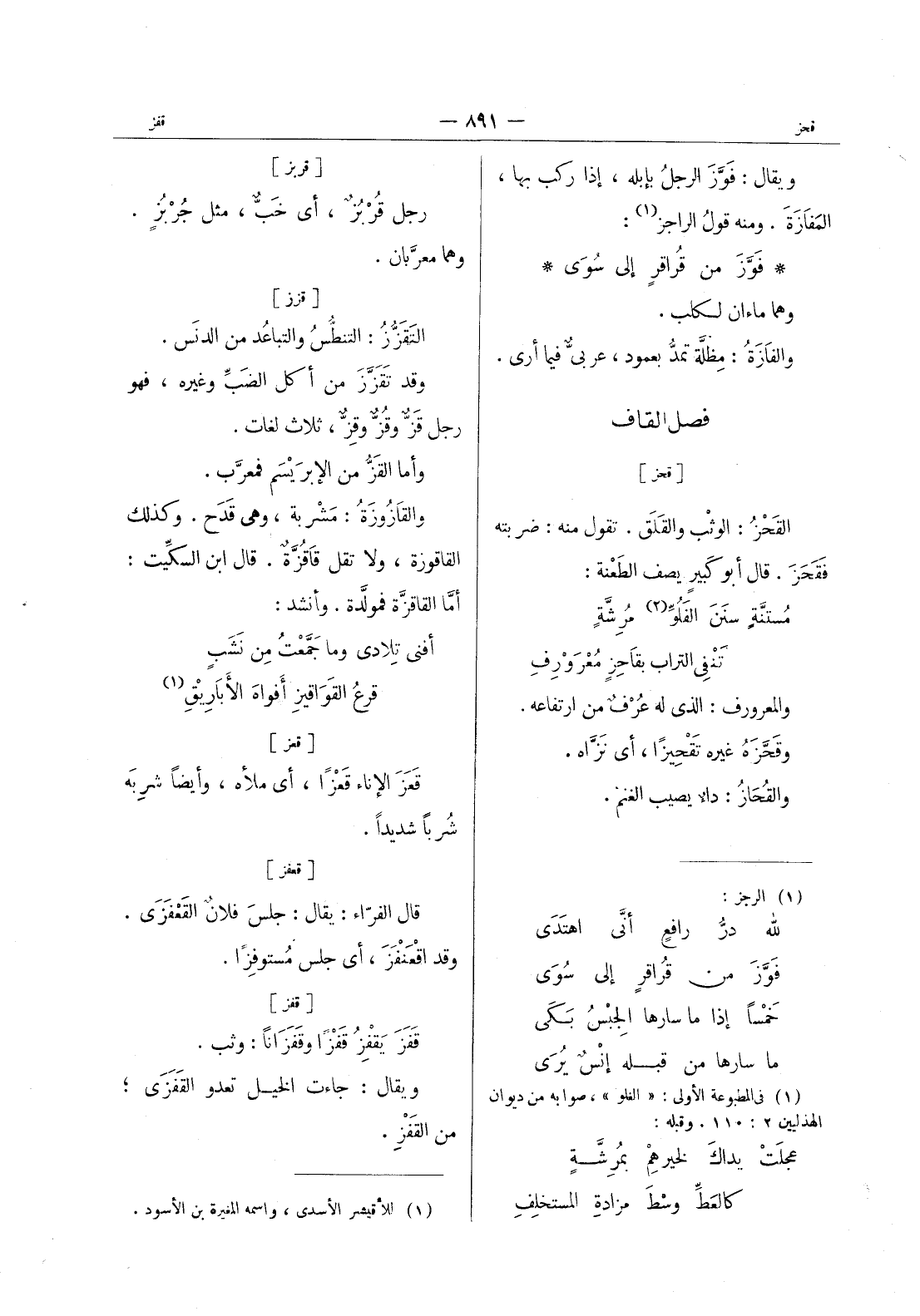[قزز] التَقَزُّزُ: التنطُّسُ والتباعد من الدنَس. وقد تَقَزَّزَ من أكل الضَبِّ وغيره، فهو رجلٌ قَزٌّ وقُزٌّ وقِزٌّ، ثلاث لغات. وأمَّا القَزُّ من الإبْرَيْسَم فمعرَّب. والقازوزَةُ: مشربة، وهى قدح. وكذلك القاقوزة، ولا تقل قاقزة. قال ابن السكيت. أما القاقزة فمولدة. وأنشد: أفنى تلادى وما جمعت من نشب * قرع القواقيز أفواه الاباريق (¬1)