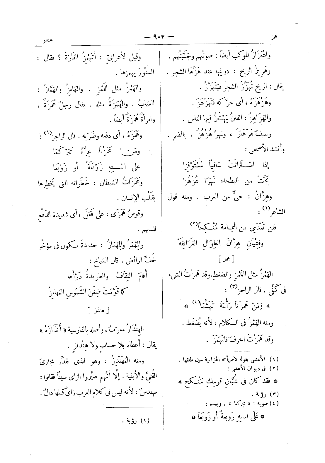 وقيل لاعرابي: أتهمز الفارة؟ فقال: السنَّورُ يهمزها. والهَمْزُ مثل اللمْزِ. والهامِزُ والهَمَّازُ: العيَّابُ. والهُمَزَةُ مثله. يقال رجلٌ هُمَزَةٌ، وامرأةٌ هُمَزَةٌ أيضاً. وهَمَزَهُ، أي دفعه وضربه. قال الراجز (¬1) : ومن همزنا عزه تبركعا * على استه زوبعة أو زوبعا * وهمزات الشيطان: خطراته التى يُخطِرها بقلب الإنسان. وقوسٌ هَمَزى، على فعلى، أي شديدة الدفع للسهم. والمِهْمَزُ والمِهْماز: حديدةٌ تكون في مؤخَّر خفِّ الرائض. قال الشماخ: أقامَ الثقاف والطريدة درأها * كما قومت ضغن الشموس المهامز