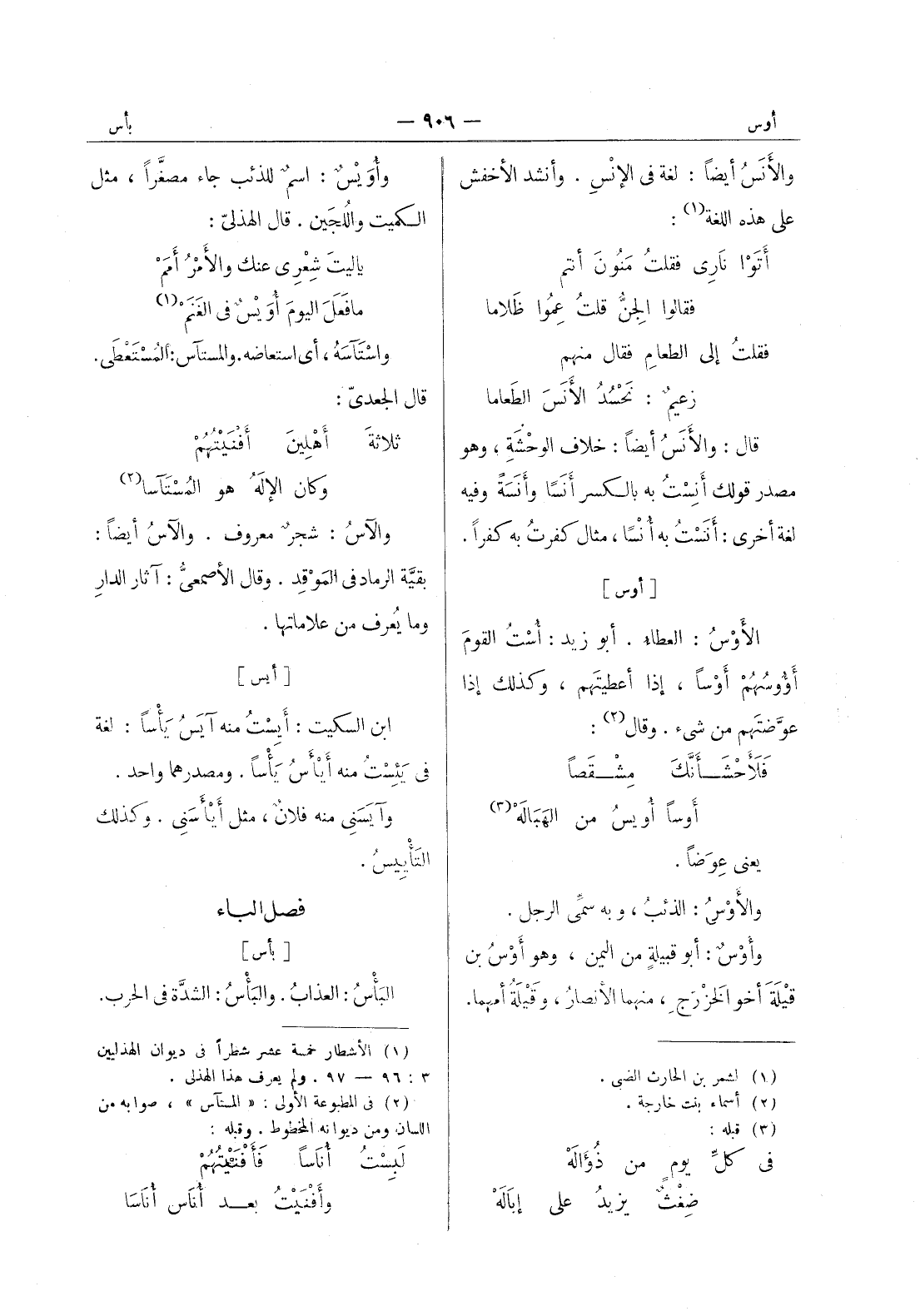 وأويس: اسم للذئب جاء مصغرا، مثل الكميت واللجين. قال الهذلى: يا ليت شِعْري عنك والأَمْرُ أَمَمْ * ما فَعَلَ اليومَ أُوَيْسٌ في الغَنَمْ (¬1) * واستآسه، أي استعاضه. والمستآس: المستعطى. قال الجعدى: ثلاثة أهلين أفنيتهم * وكان الاله هو مستآسا (¬2) * والآسُ: شجرٌ معروف. والآسُ أيضاَ: بقيَّة الرماد في المَوْقِد. وقال الأصمعيّ: آثار الدارِ وما يُعرف من علاماتها.