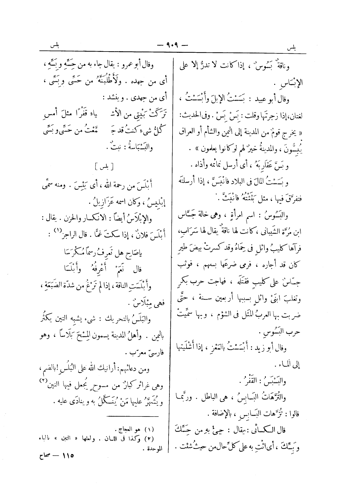 [بلس] أَبْلَسَ من رحمة الله، أي يَئِسَ. ومنه سمِّي إبْليسُ، وكان اسمه عَزازِيلُ. والإِبْلاسُ أيضاً: الانكسار والحزن. يقال: أَبْلَسَ فلانٌ، إذا سكت غما. قال الراجز (¬1) : يا صاح هل تعرف رسما مكرسا * قال نعم أعرفه وأبلسا * وأبلست الناقة، إذا لم تَرْغُ من شدّة الضَبَعَةِ، فهي مِبْلاسٌ. والبَلَسُ بالتحريك: شئ يشبه التين يكثر باليمن. وأهلُ المدينة يسمون المِسْحَ بَلاساً، وهو فارسيّ معرّب. ومن دعائهم: أرانيك الله على البُلُسِ! بالضم، وهي غرائر كبارٌ من مسوحٍ يُجعل فيها التين (¬2) ويُشَهَّرُ عليها مَنْ يُنَكَّلُ به وينادى عليه.