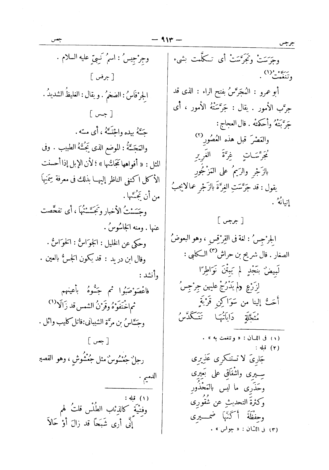 [جسس] جَسَّهُ بيده واجْتَسَّهُ، أي مسّه. والمَجَسَّةُ: الموضع الذي يَجُسُّهُ الطبيب. وفى المثل: " أفواهها مجاسها " ; لان الابل إذا أحسنت الاكل اكتفى الناظر إليها بذلك في معرفة سمنها من أن يجسها. وجسست الاخبار وتجسستها، أي تفحصت عنها. ومنه الجاسوس. وحكى عن الخليل: الجواس: الحواس. وقال ابن دريد: قد يكون الجس بالعين. وأنشد: فاعصوصبوا ثم جسوه بأعينهم * ثم اختفوه وقرن الشمس قد زالا (¬1) * وجساس بن مرة الشيباني: قاتل كليب وائل.