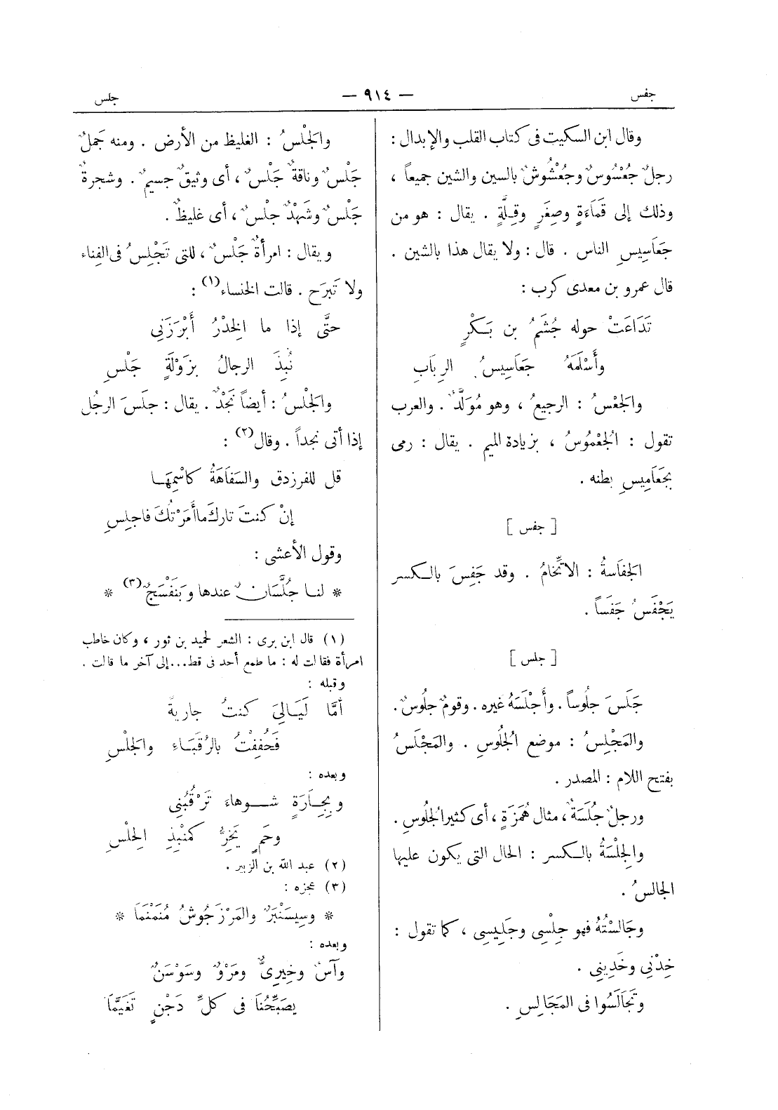 والجلس: الغليظ من الأرض. ومنه جَملٌ جَلْسٌ وناقةٌ جَلْسٌ، أي وثيقٌ جسيمٌ. وشجرةٌ جَلْسٌ وشَهْدٌ جلْسٌ، أي غليظٌ. ويقال: امرأةٌ جَلْسٌ، للتي تَجْلِسُ في الفناء ولا تبرح. قالت الخنساء (¬1) : حتى إذا ما الخدر أبرزني * نبذ الرجال بزولة جلس * والجلس: أيضا نجد. يقال: جلس الرجل إذا أتى نجدا. وقال (¬2) : قل للفرزدق والسفاهة كاسمها * إن كنت تارك ما أمرتك فاجلس * وقول الاعشى: