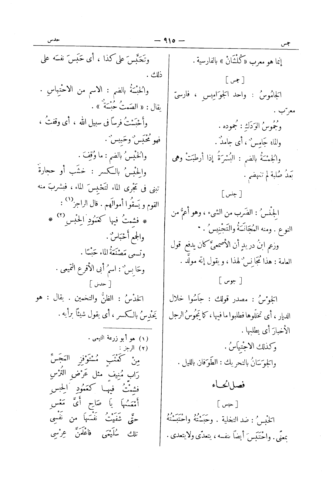 فمشت فيها كعمود الجبس (¬2) * والجمع أَحْباسٌ. وتسمى مَصْنَعَةُ الماء حَبْساً. وحابس: اسم أبى الاقرع التميمي.