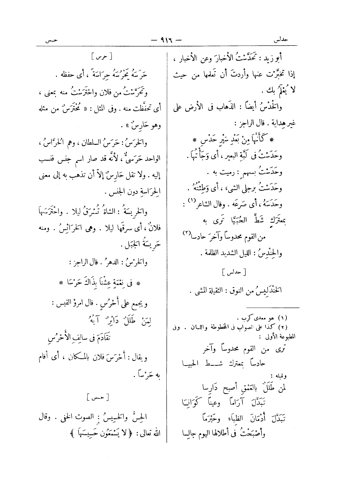 (¬2) كذا على الصواب في المخطوطة واللسان. وفى المطبوعة الاولى: ترى من القوم محدوسا وآخر * حادسا بمعترك شط الحبيا * وقبله: لمن طلل بالعمق أصبح دارسا * تبدل آراما وعينا كوانسا * تبدل أدمان الظباء وحيرما * وأصبحت في أطلالها اليوم جالسا: