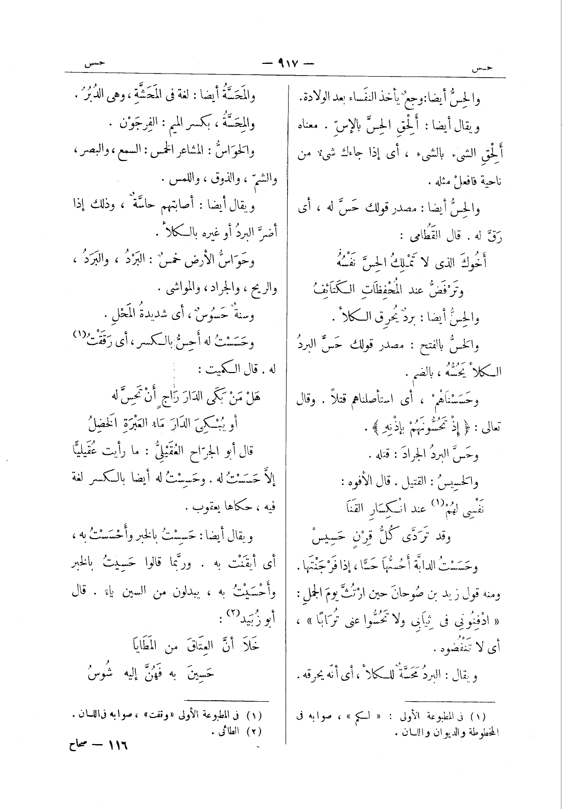 والمحسة أيضاً: لغة في المَحَشَّةِ، وهي الدبر. والمحسة، بكسر الميم: الفرجون. والحواس: المشاعر الخمس: السمع، والبصر، والشمّ، والذوق، واللمس. ويقال أيضاً: أصابتهم حاسَّةٌ، وذلك إذا أضرَّ البردُ أو غيره بالكلأ. وحَواسُّ الأرض خمسٌ: البَرْدُ، والبَرَدُ، والريح، والجراد، والمواشي. وسنةٌ حَسوسٌ، أي شديدةُ المَحْلِ. وحَسَسْتُ له أَحِسُّ بالكسر، أي رَقَقْتُ (¬1) له. قال الكميت: هَلْ مَنْ بَكى الدار راج أن تحس له * أو يُبْكيَ الدارَ ماءُ العَبْرَةَ الخَضِلُ * قال أبو الجرّاح العُقَيْليُّ: ما رأيت عُقَيليَّاً إلاَّ حَسَسْتُ له. وحَسِسْتُ له أيضاً بالكسر لغة فيه، حكاها يعقوب. ويقال أيضا: حسست بالخبر وأَحْسَسْتُ به، أي أَيْقَنْتُ به. وربما قالوا حسيت بالخبر وأحسيت به، يبدلون من السين ياء. قال أبو زبيد (¬2) : خلا أن العتاق من المطايا * حَسينَ به فَهُنَّ إليه شوس *