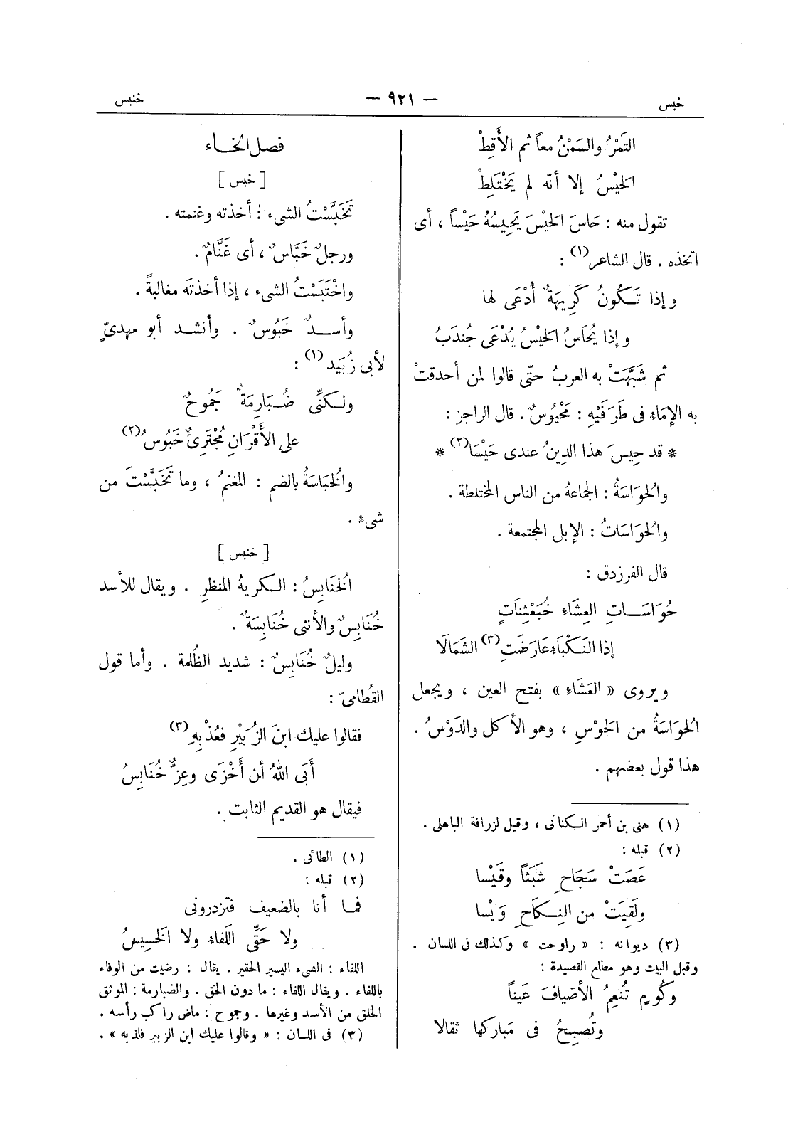 [خنبس] الخُنابِسُ: الكريهُ المنظرِ. ويقال للأسد خُنابِسٌ والأنثى خُنابِسَةٌ. وليلٌ خنابس: شديد الظلمة. وأما قول القطامى: فقالوا عليك ابن الزبير فعذبه (¬3) * أبى الله أن أخزى وعز خنابس * فيقال هو القديم الثابت.
